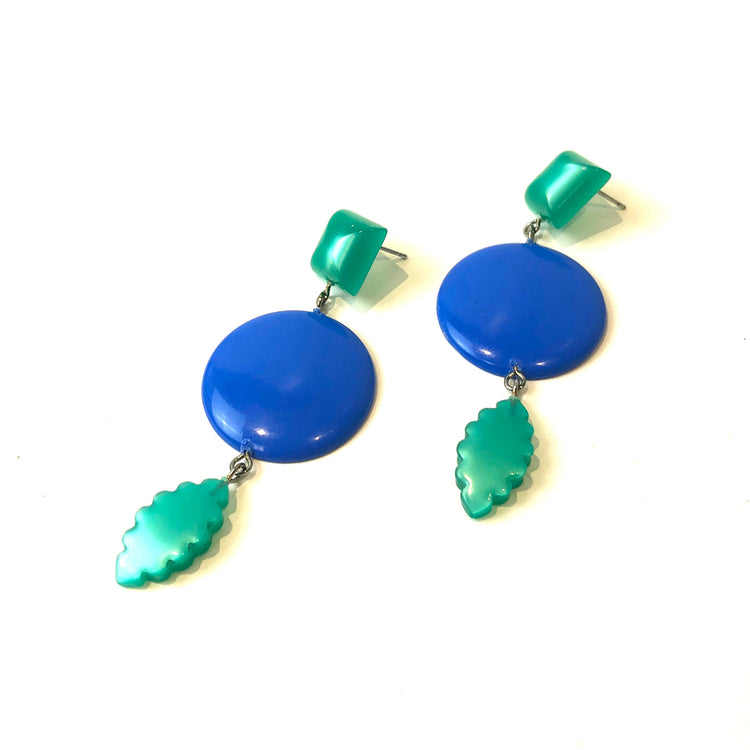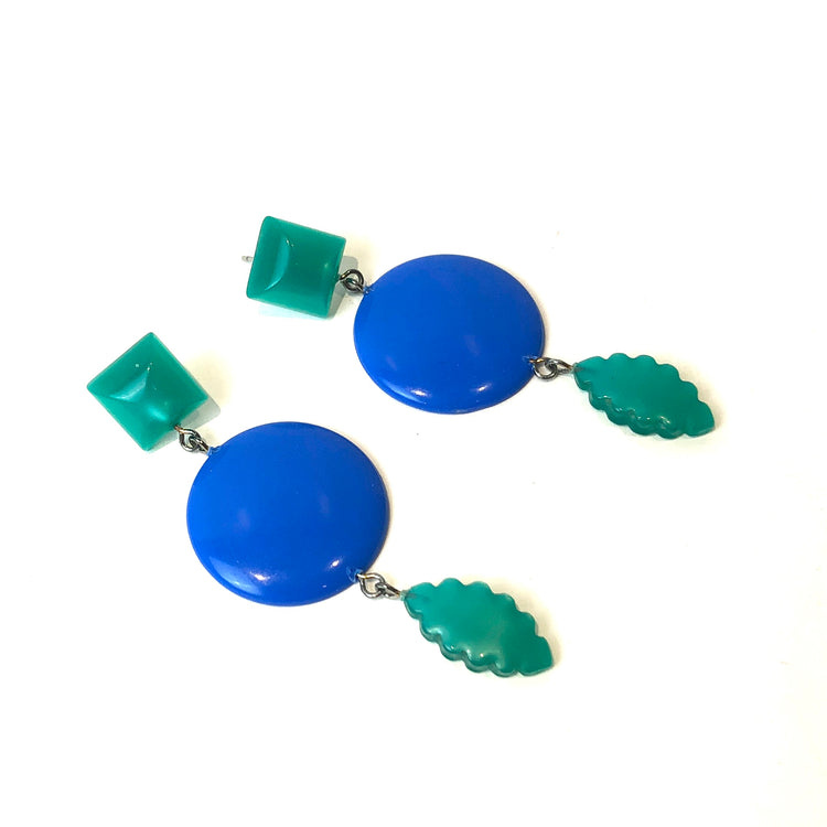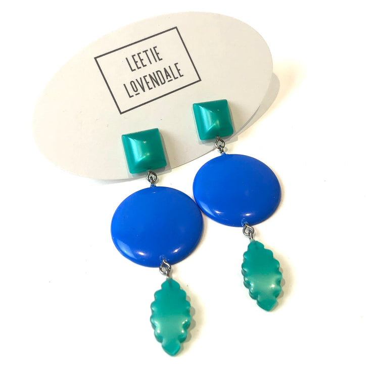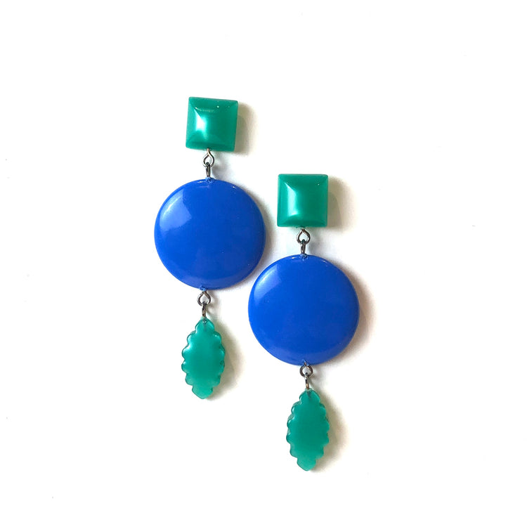 Cornflower blue meet emerald green geometric shapes cascade in these elegant and retro-vibe statement earrings. Each earring measures just about 3" length & are super light weight.
