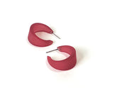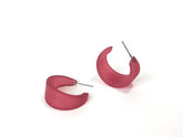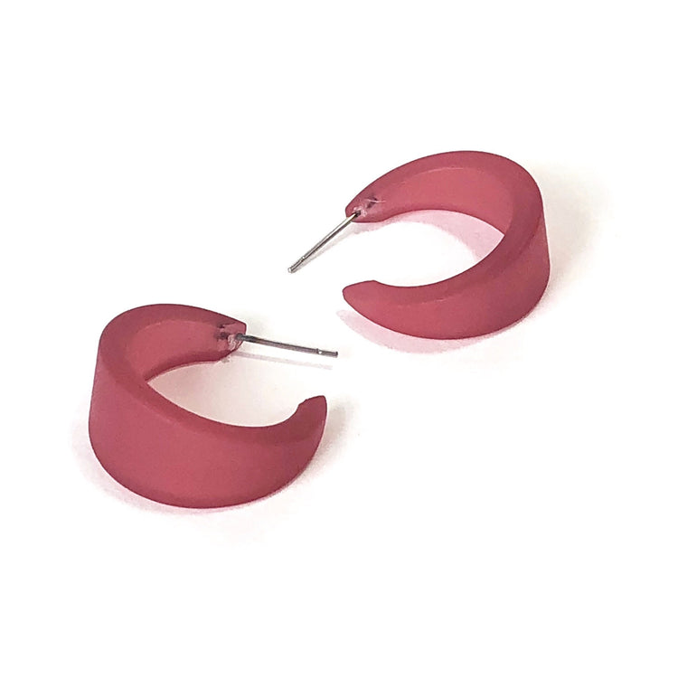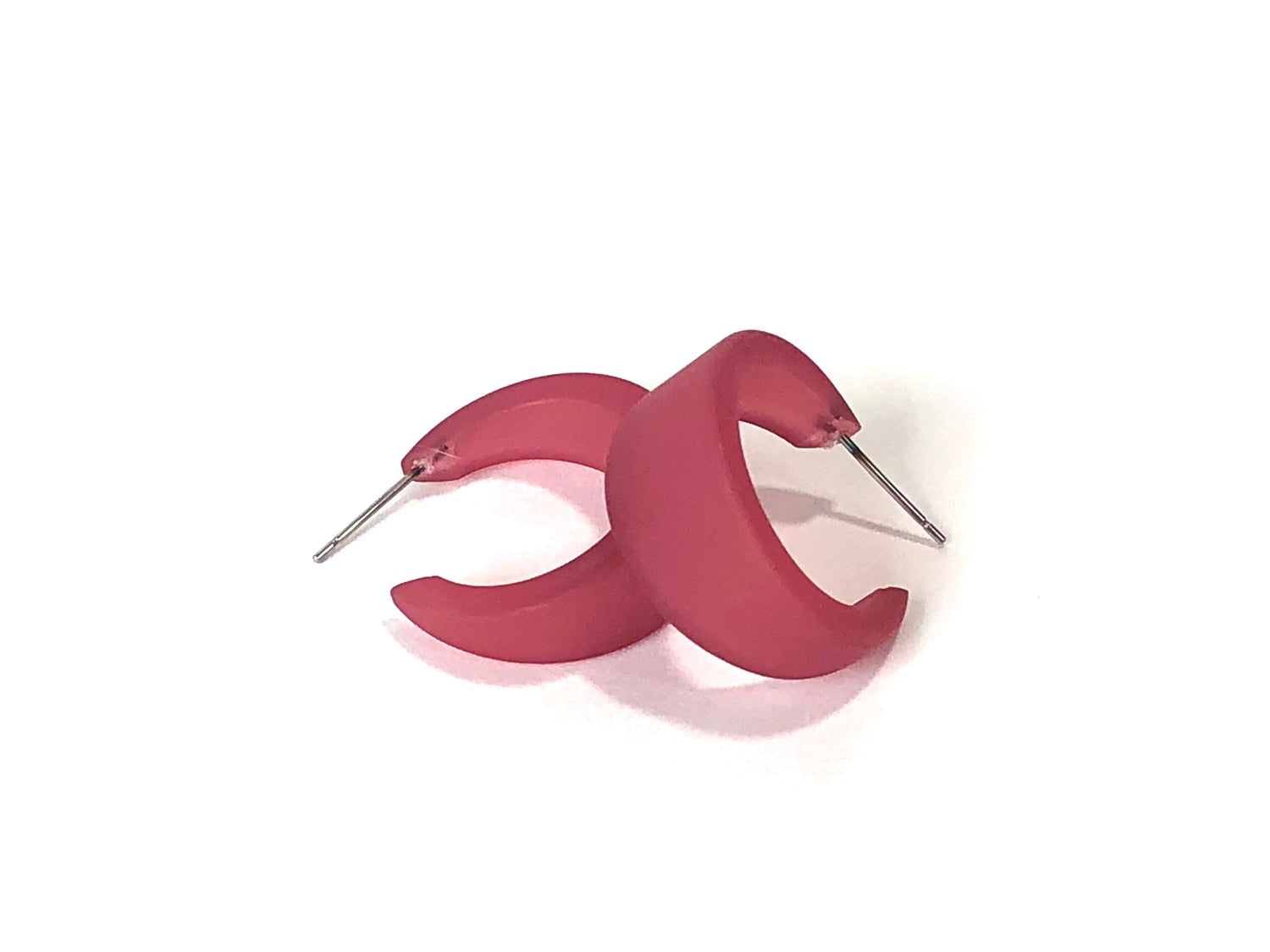 Hoop earrings in the small size of the Marilyn style hoop, a modern style hoop with a frosted finish. The Marilyn Hoop is a tapering or waning shape that starts & ends at a point and widens in the middle. The small version of the Marilyn Hoop measures 1" or 24mm in diameter and 14mm in width. Check out the last pic of the model wearing this size & style in the Clear and Red to get an idea of what they'll look like when you rock them!