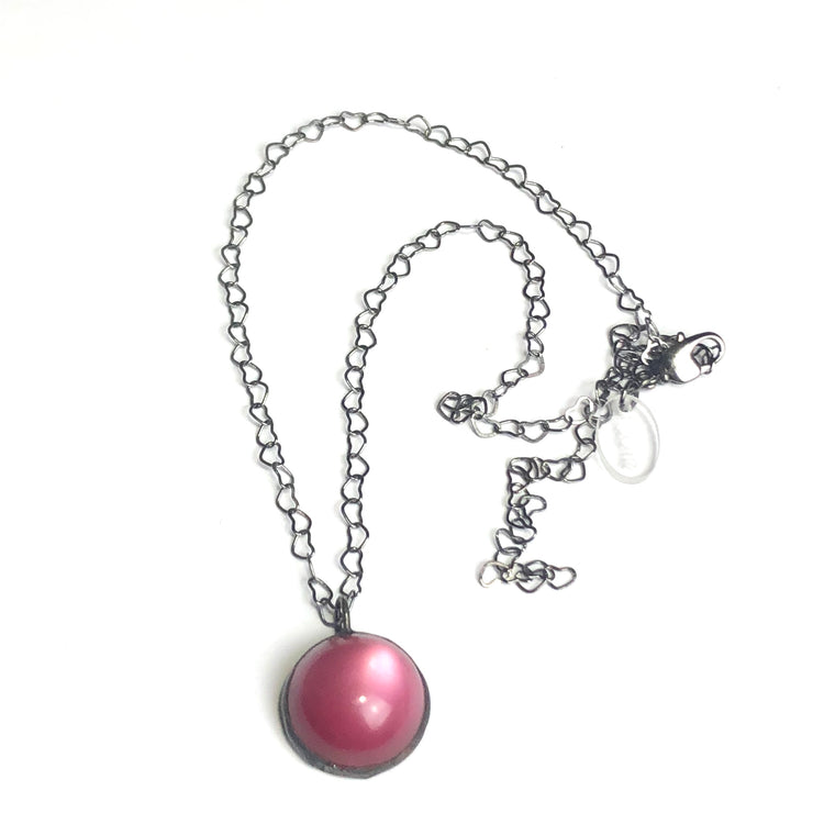 Deep cranberry moonglow domed pendant, hand-wrought with matte black metals & vintage components. Chain is hypoallergenic gun metal & in a heart link style. Measures 16" + a 4" adjustable extender.