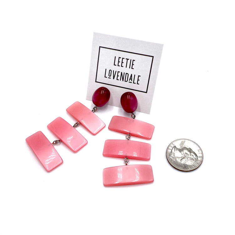 Cranberry moonglow oval studs meet light rose pink links in these retro meets today earrings. Each earring measures just under 3" or 76mm in length & are super light weight.