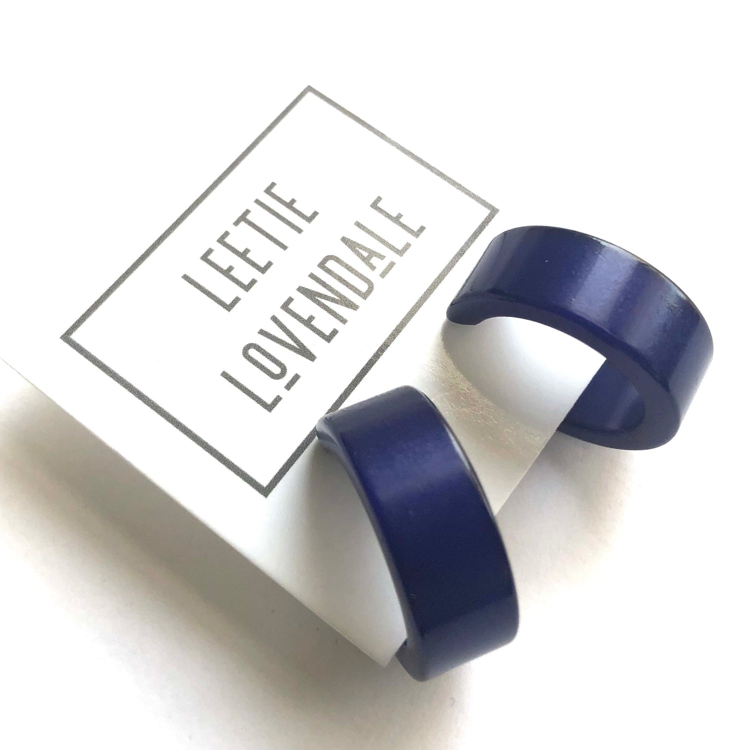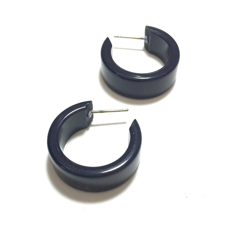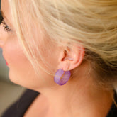 Hoop earrings with a retro moonglow finish & made with vintage plastics. This style is known as the Clara Hoop, previously known as the Wide Classic Hoop style. Each measures approximately 1" in diameter and about 15mm in width.
