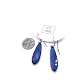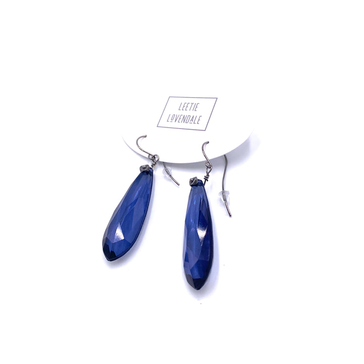 Denim blue faceted briolette drop earrings with frosted gold hypoallergenic leverbeck earwires. Deep purpley-blue earrings made with lucite that looks like glass, but weighs almost nothing. Each measures 2.2" in length. Earwires are frosted black metal hypoallergenic base metal.