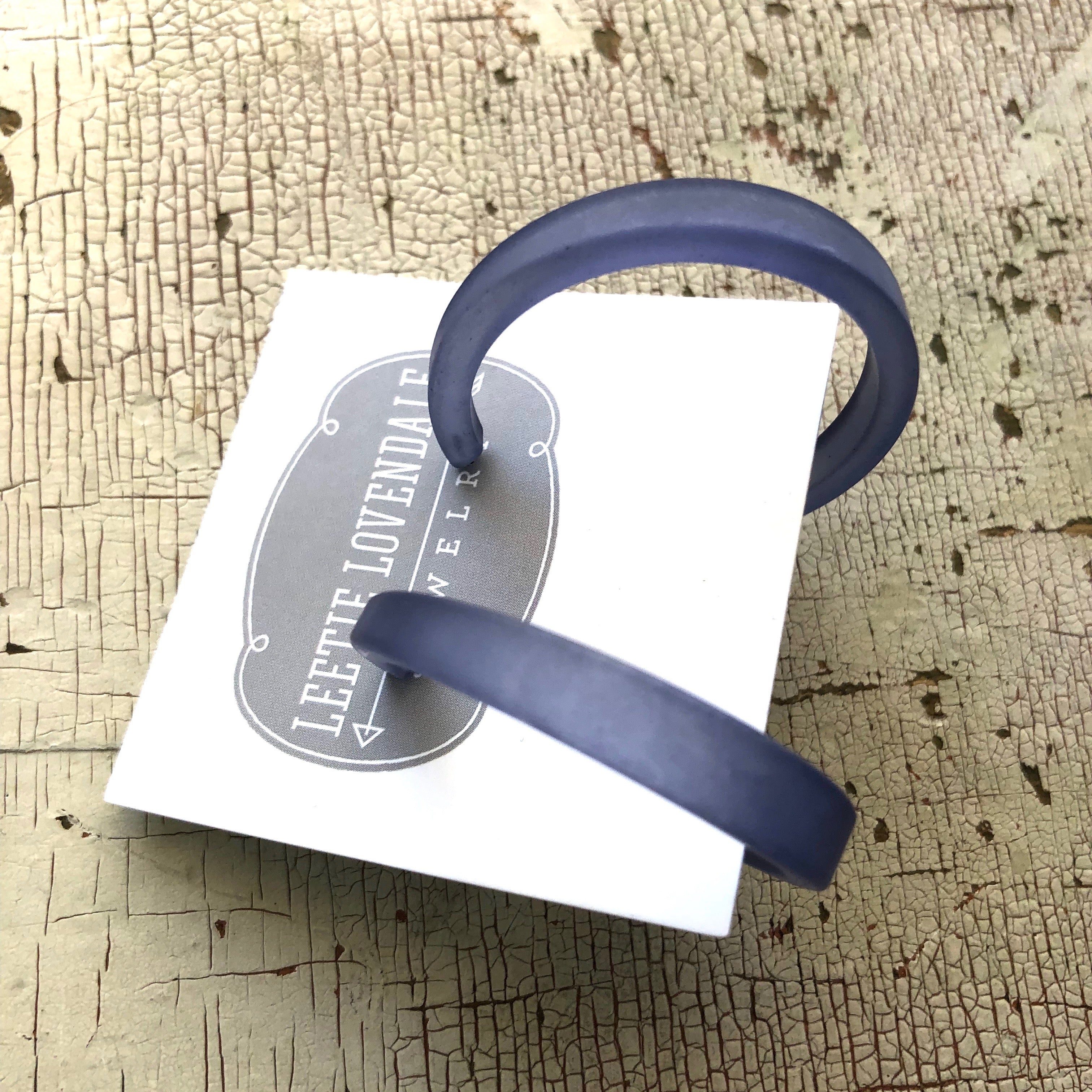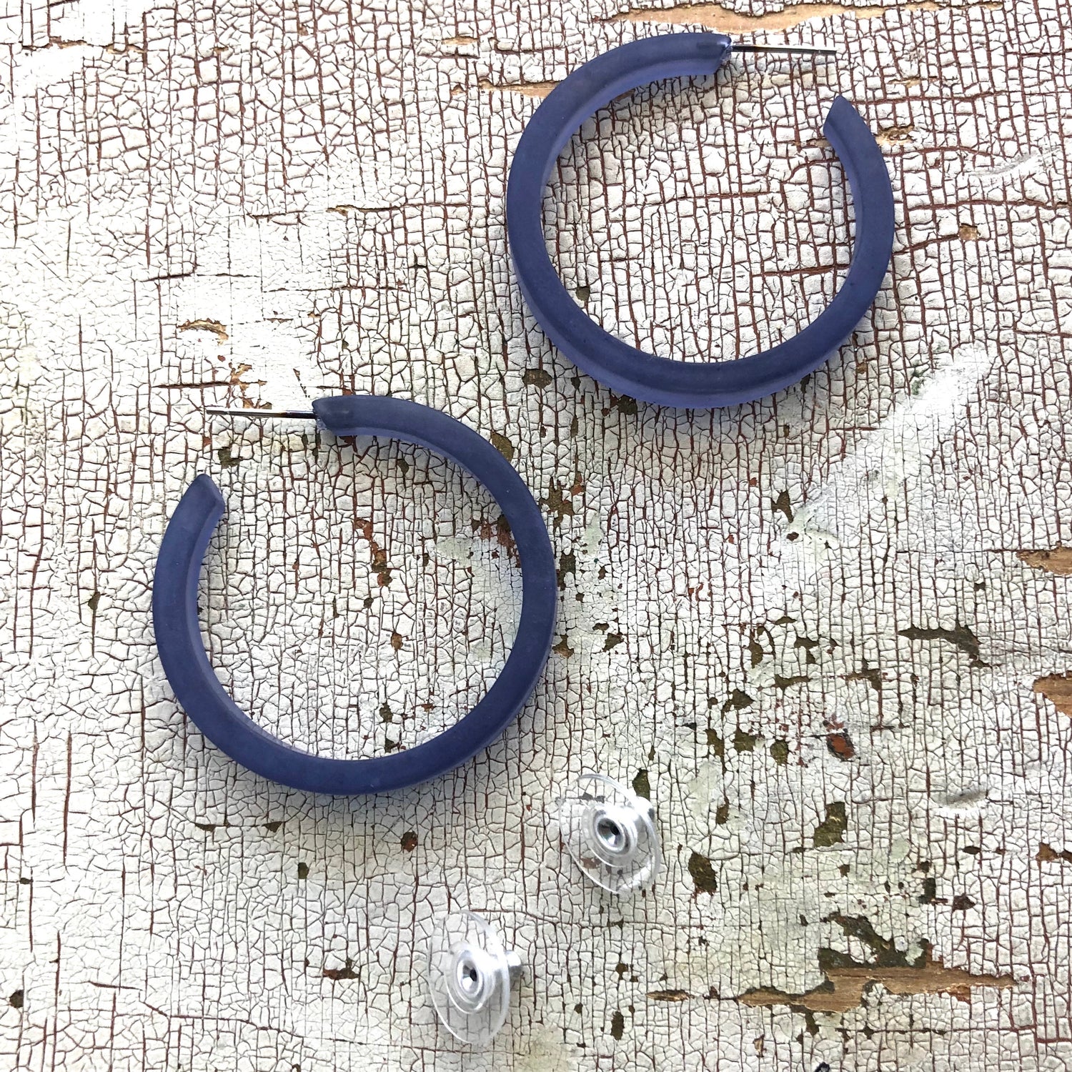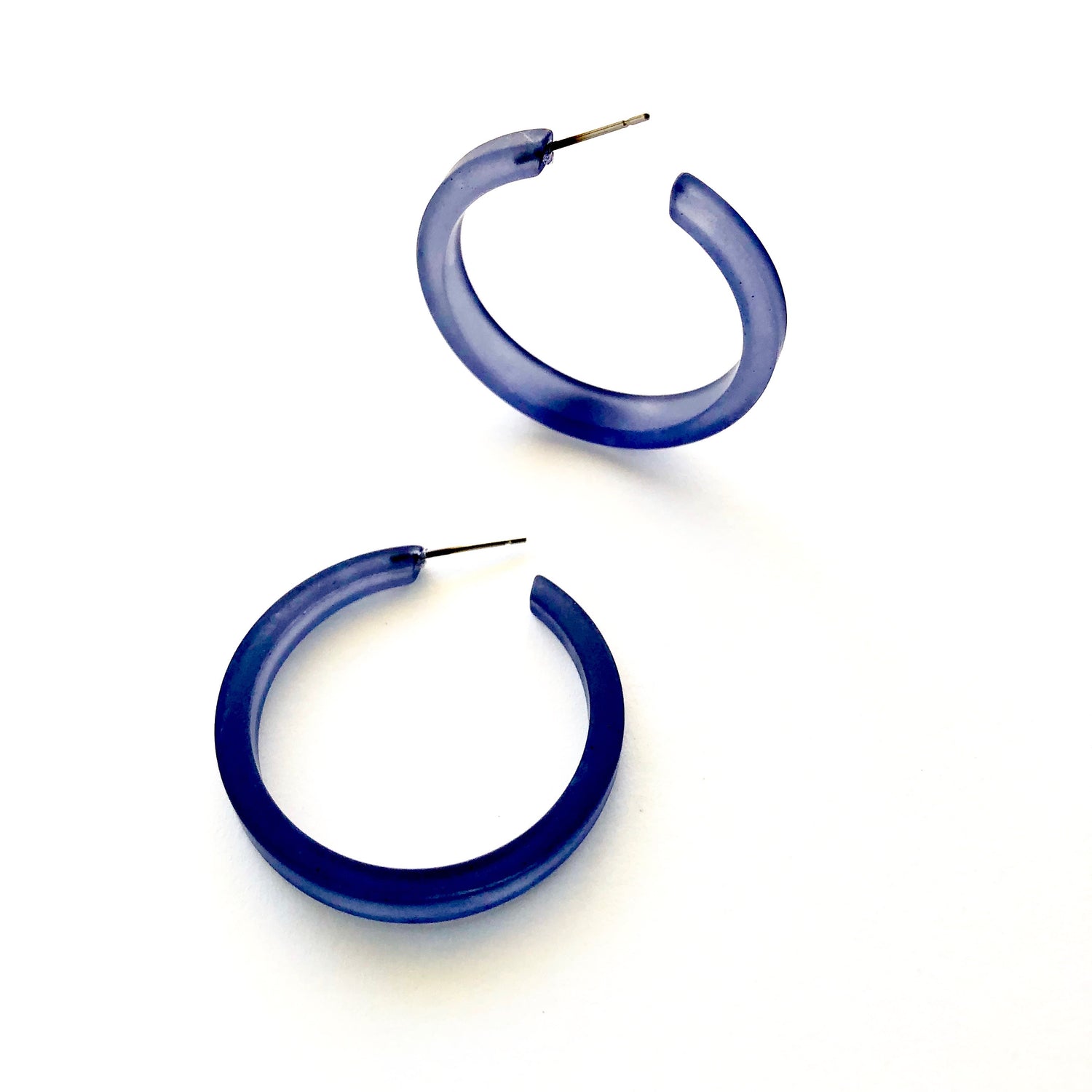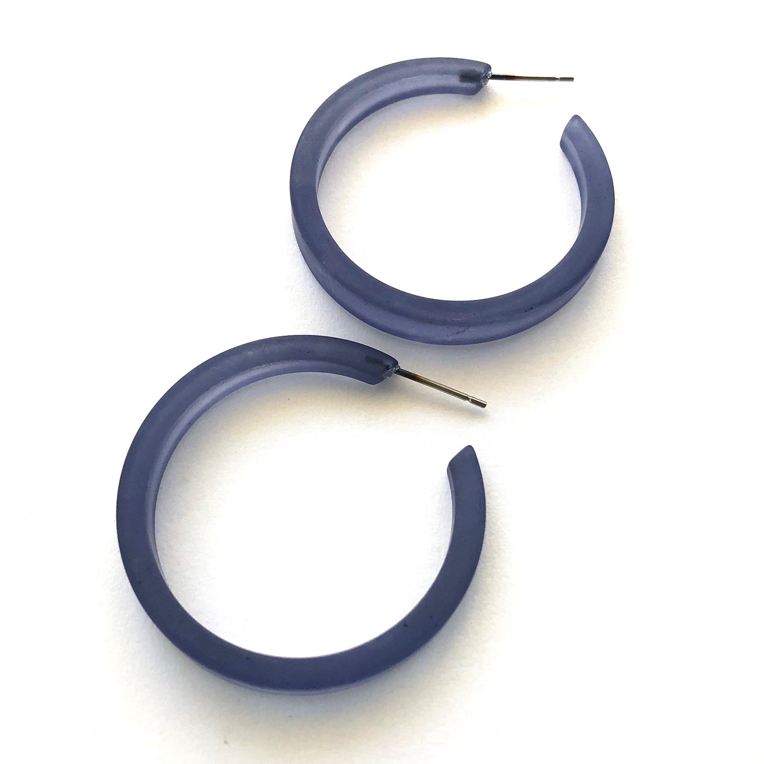 Frosted hoop earrings in a finely shaped & tapered hoop shape that measures approximately 1.5" or 37mm in diameter and 7mm at the widest. This style is known as the Phoenix Hoop. This finish is so super popular and this is one of the most popular colors in the line. The finish is lucite but it resembles sea glass.