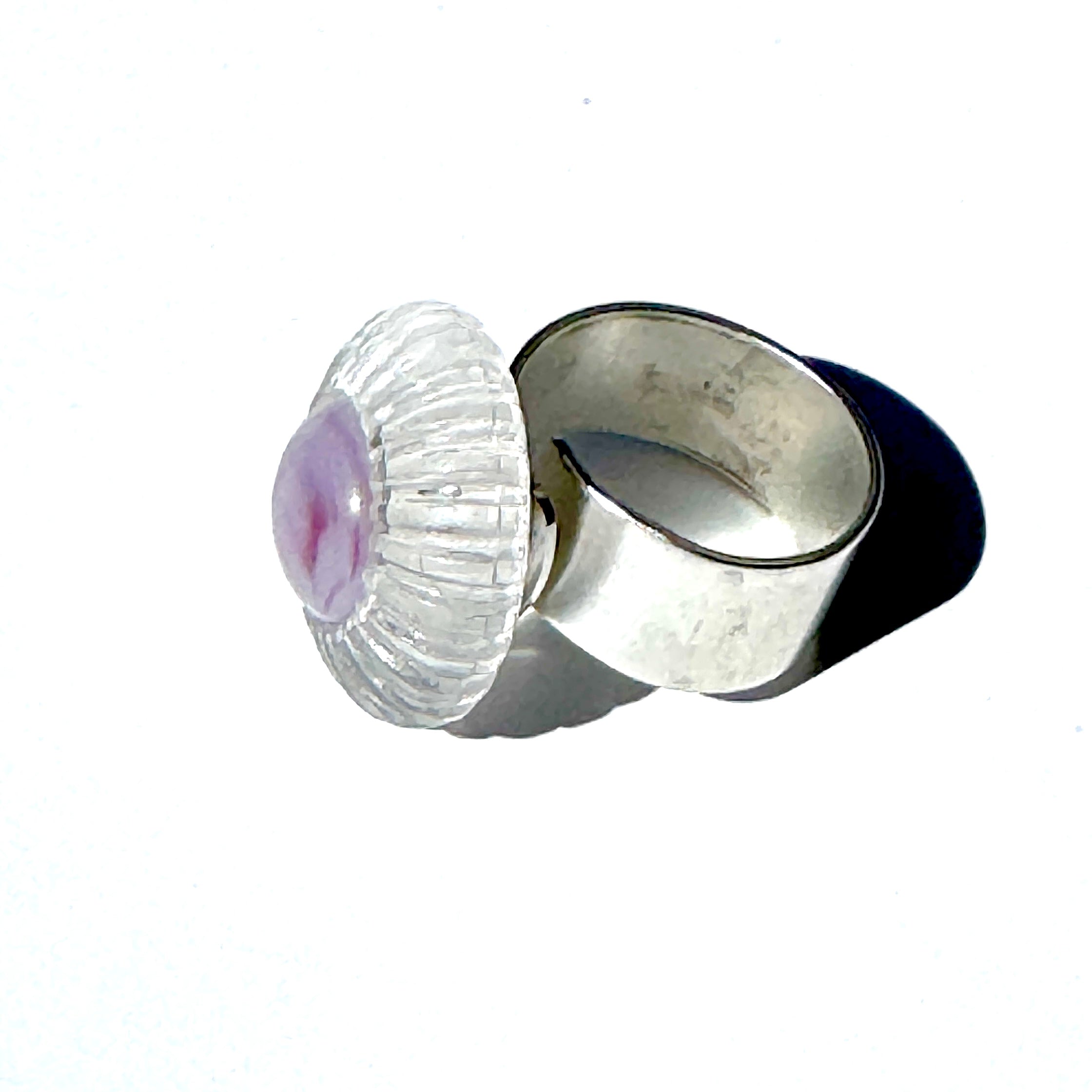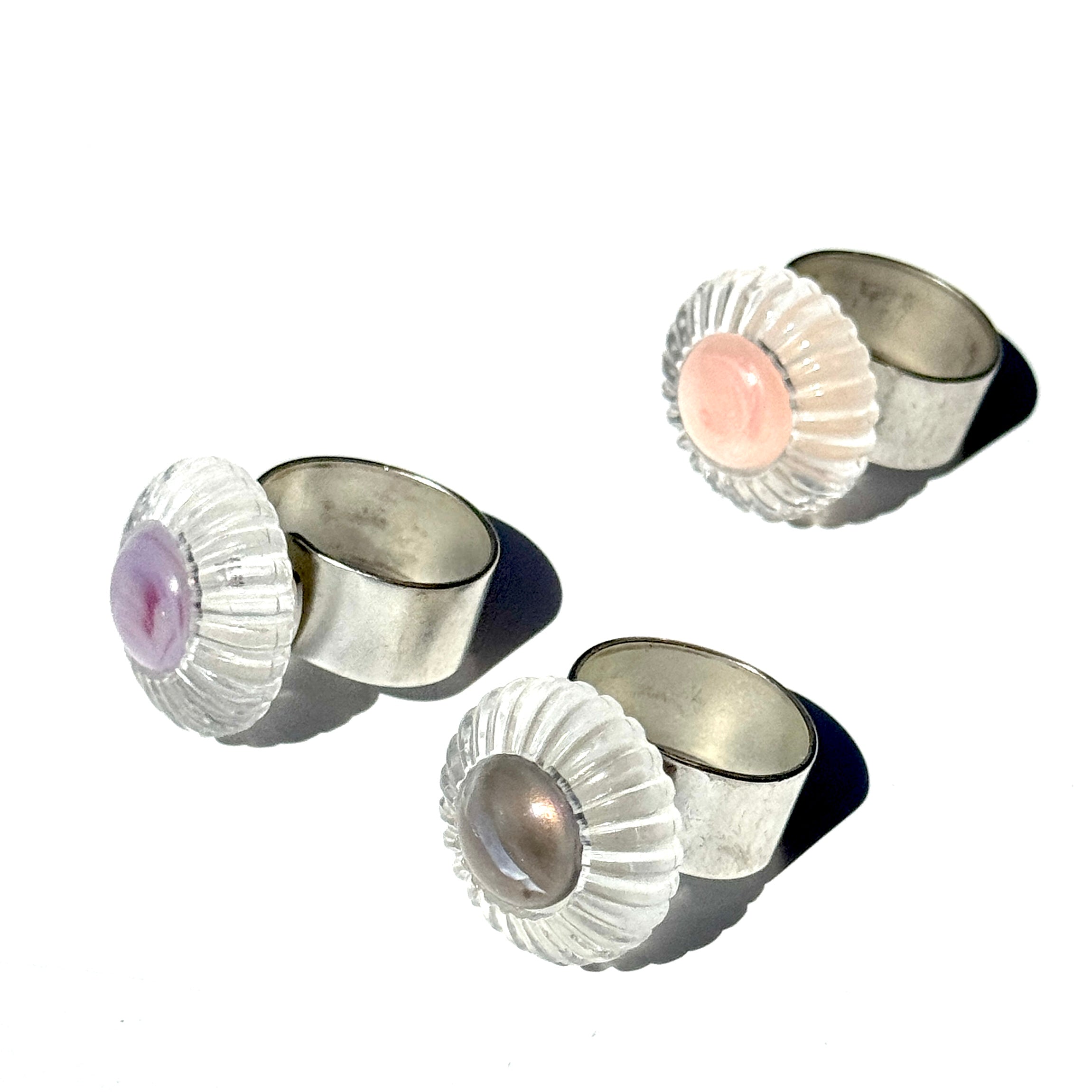 Twice the texture, double the glow—these cocktail rings are a bold blast from the past. Featuring a frosted fluted lucite halo topped with a dreamy domed cabochon, each one is a mini marvel of vintage charm. Set on our signature silver-plated adjustable bands, they’re made to shine in every colorway.