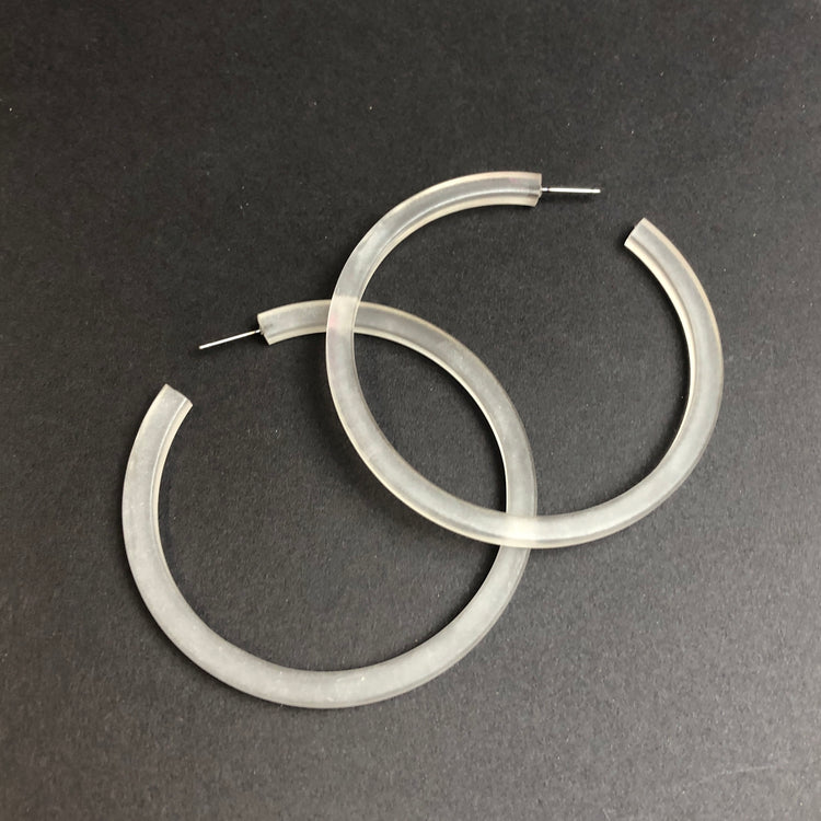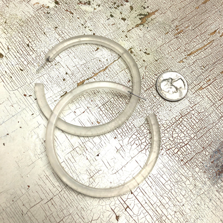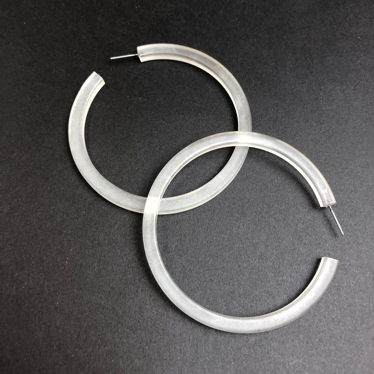 Clear hoop earrings in a great bold size & a frosted but see-through finish. This Bnalge Hoop is wider than most and measures about 6mm in thickness. The Bangle Hoop Earring is one of our largest styles. Because they are made with vintage lucite parts, they are super light weight even though they're big & bold. Hoops measure approximately 3" in diameter.