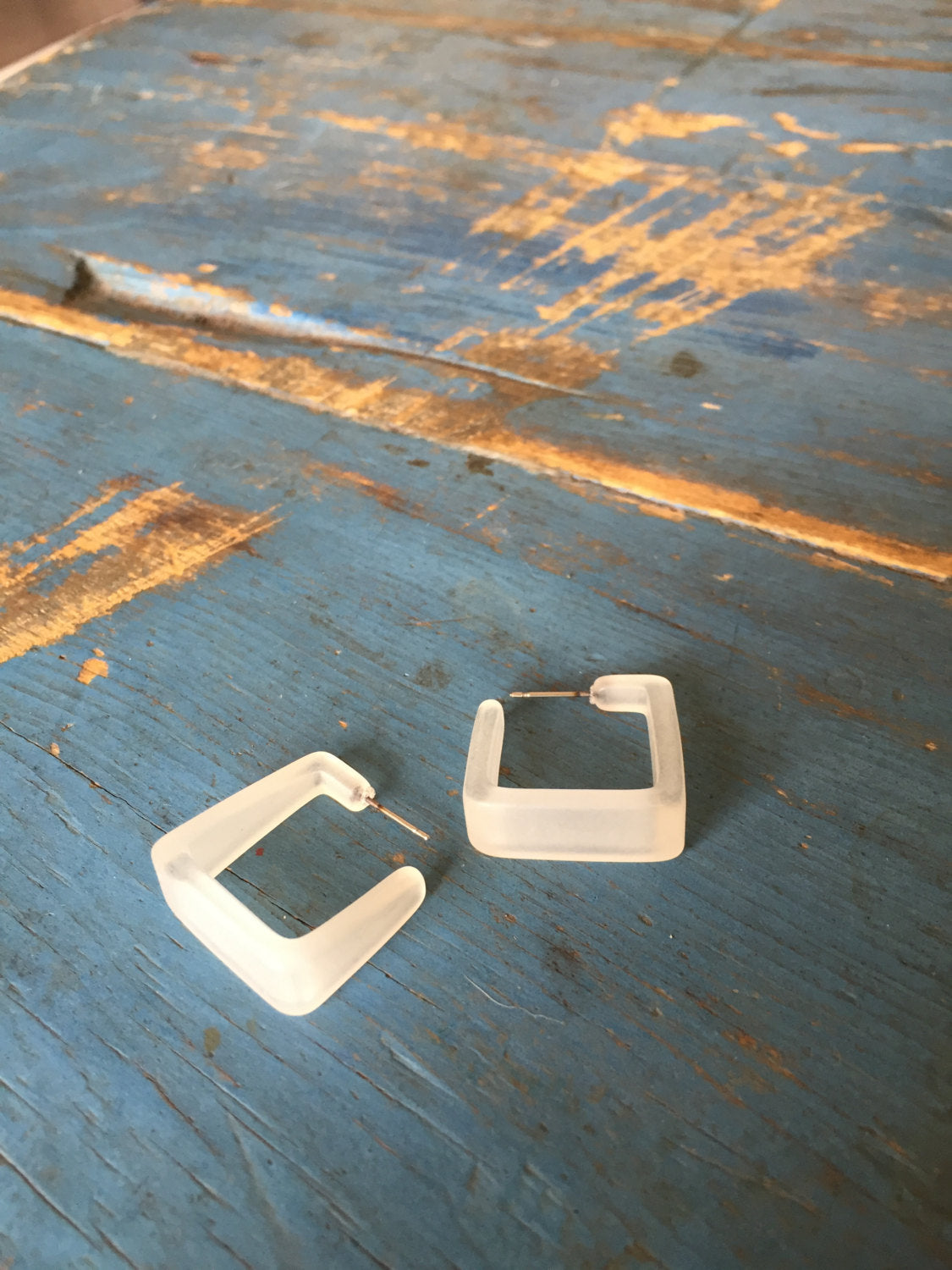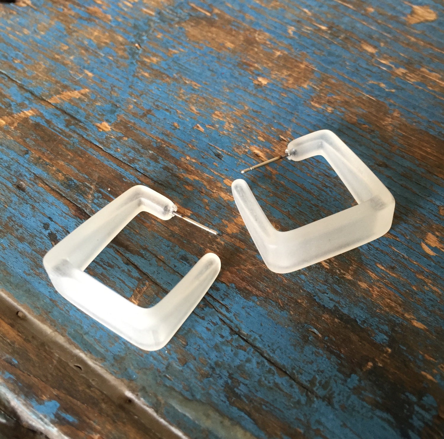 Get ready to jazz up your style with these Cubist Hoop Earrings! These vibrant geometric earrings feature a sleek, tapered design and a frosted finish. Each square hoop has a diameter of 1" or 25mm, adding a touch of minimalist cool to your look. Made with vintage lucite parts from the 1960's to early 80's, they're set with surgical steel earring posts and come with sturdy surgical steel/acrylic backings. Plus, they're lightweight and oh-so-fun to wear!