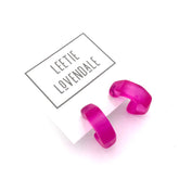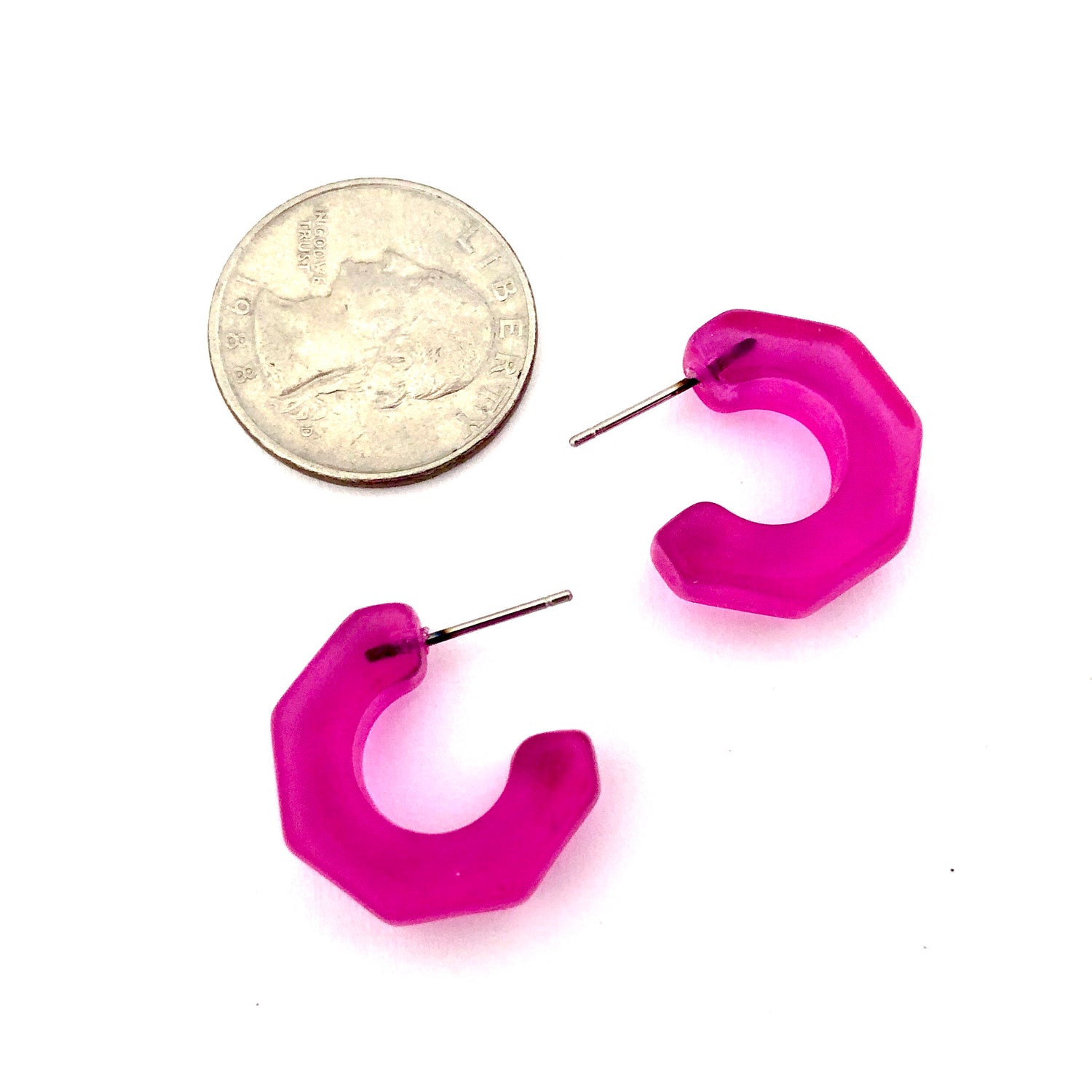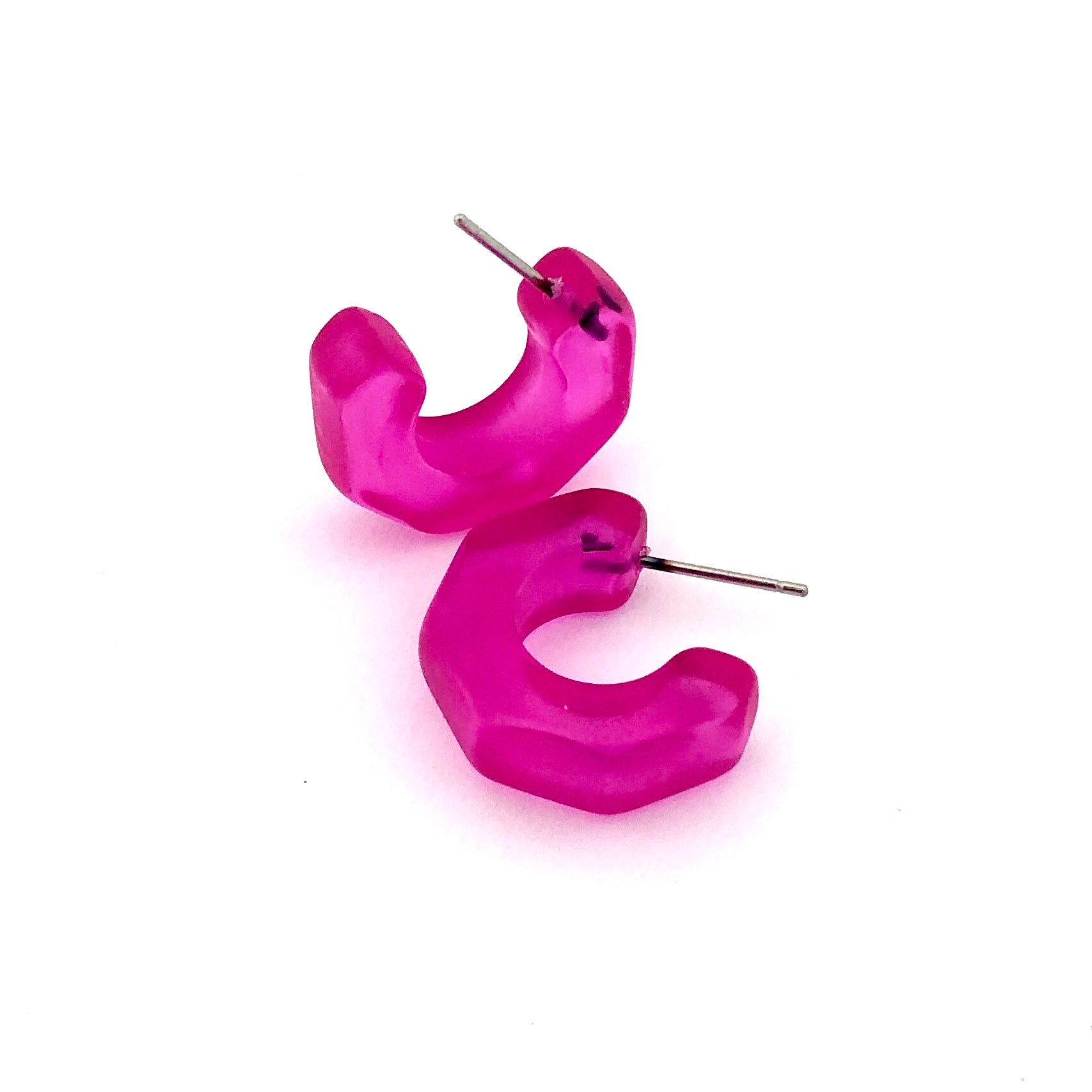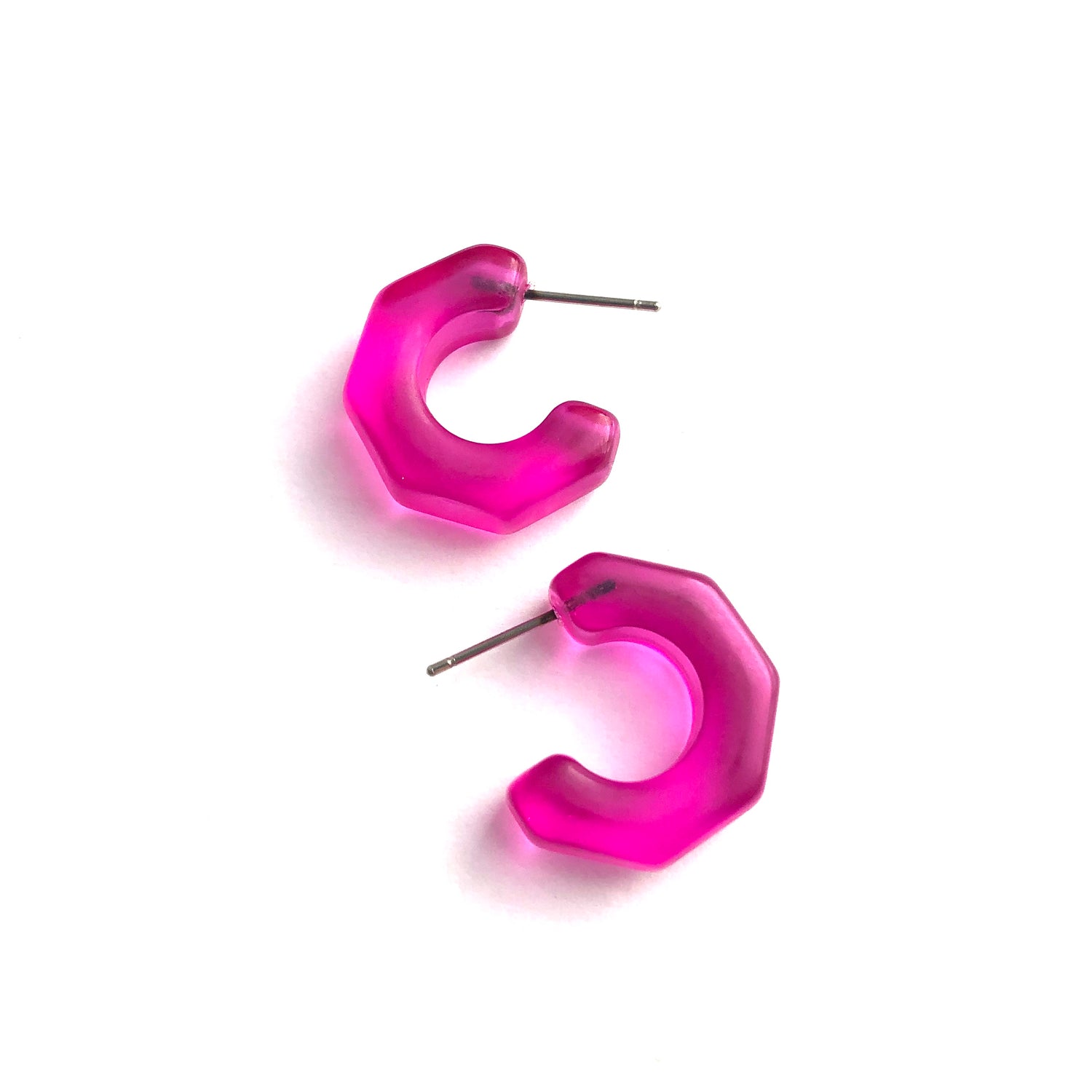 Chunky lobe-hugging hoop earrings with faceted edges, known as the Gracie Hoops, made with lucite. Each is about 3/4" in diameter. Super retro, geometric shape, these are a light-weight earring set by hand with surgical steel. We unearthed these vintage plastics in Europe & finish them off in our AZ studio.