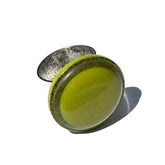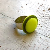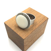 This ring features a vintage resin 'stone' with a border of dark silver glitter. This vintage lucite has a shiny but semi-matte finish. Base stone is 25mm in diameter. Made with a matte antique silver ring base AND adjustable. Fits all or most sizes. The plating on the band is made with .999 fine silver over brass and is 9.5mm wide.