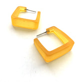 Get ready to jazz up your style with these Cubist Hoop Earrings! These vibrant geometric earrings feature a sleek, tapered design and a frosted finish. Each square hoop has a diameter of 1" or 25mm, adding a touch of minimalist cool to your look. Made with vintage lucite parts from the 1960's to early 80's, they're set with surgical steel earring posts and come with sturdy surgical steel/acrylic backings. Plus, they're lightweight and oh-so-fun to wear!