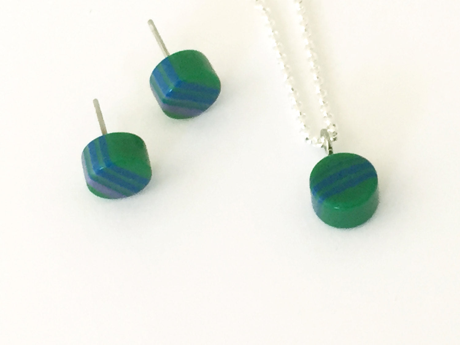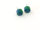 Darling size post earrings in emerald green, deep blue & purple striped plastics. This is the pair of earrings that goes with every outfit. Each measures 8mm in diameter. See the last pic for the scale of how they look when worn (the squares in that pic are about the same size). And the 2nd pic shows the matching necklace that is available.