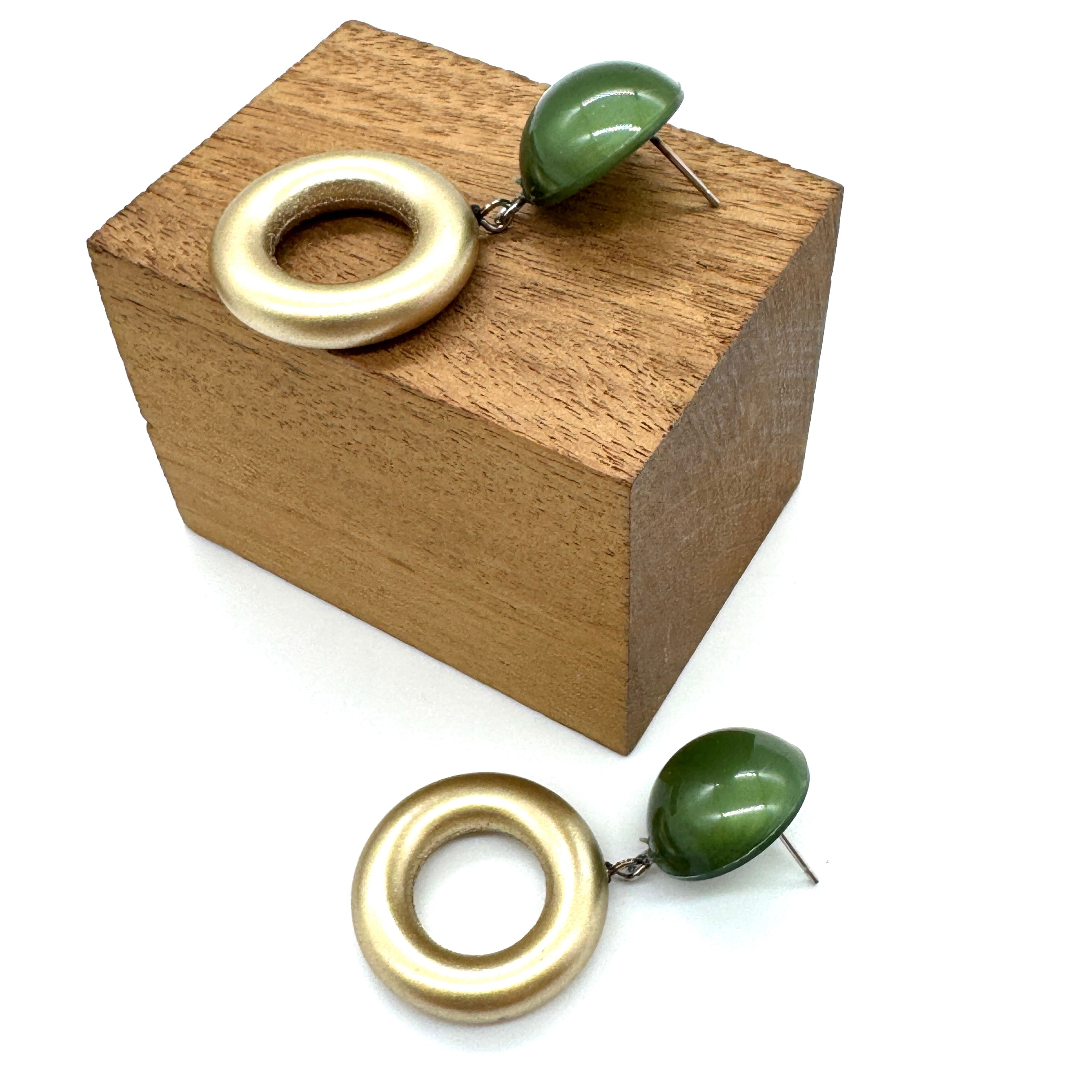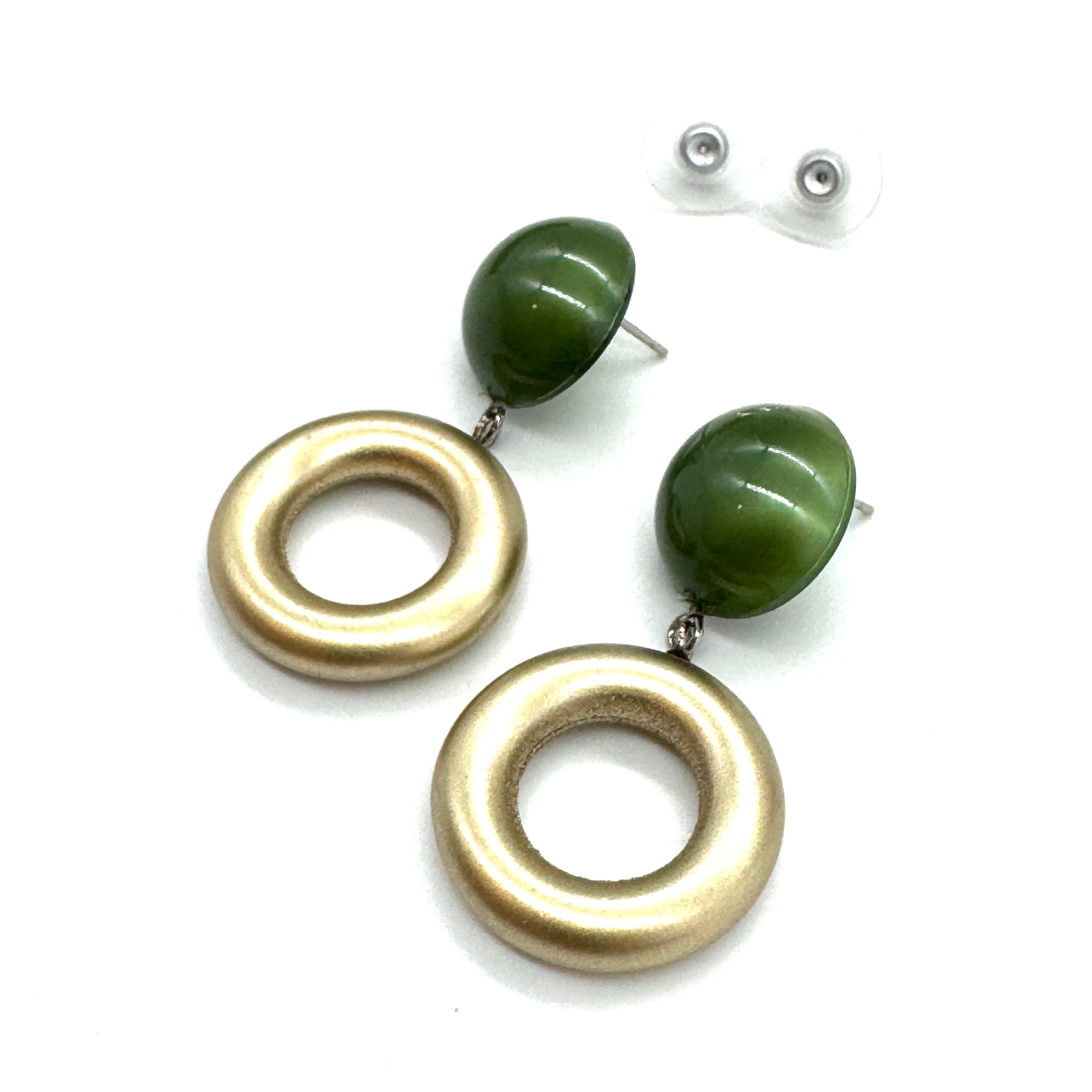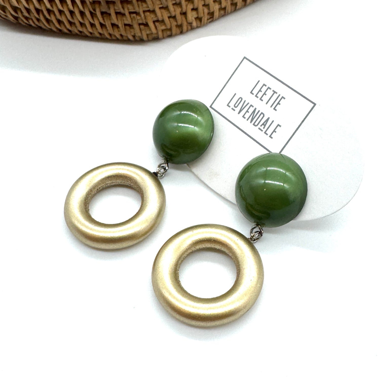 Super lightweight with a big impact, these bold statement earrings bring a perfect blend of trend and timelessness. Featuring a glowing forest green paired with rich, matte gold, each pair showcases contemporary donut-shaped accents that dangle beneath striking vintage 1980s Lucite.