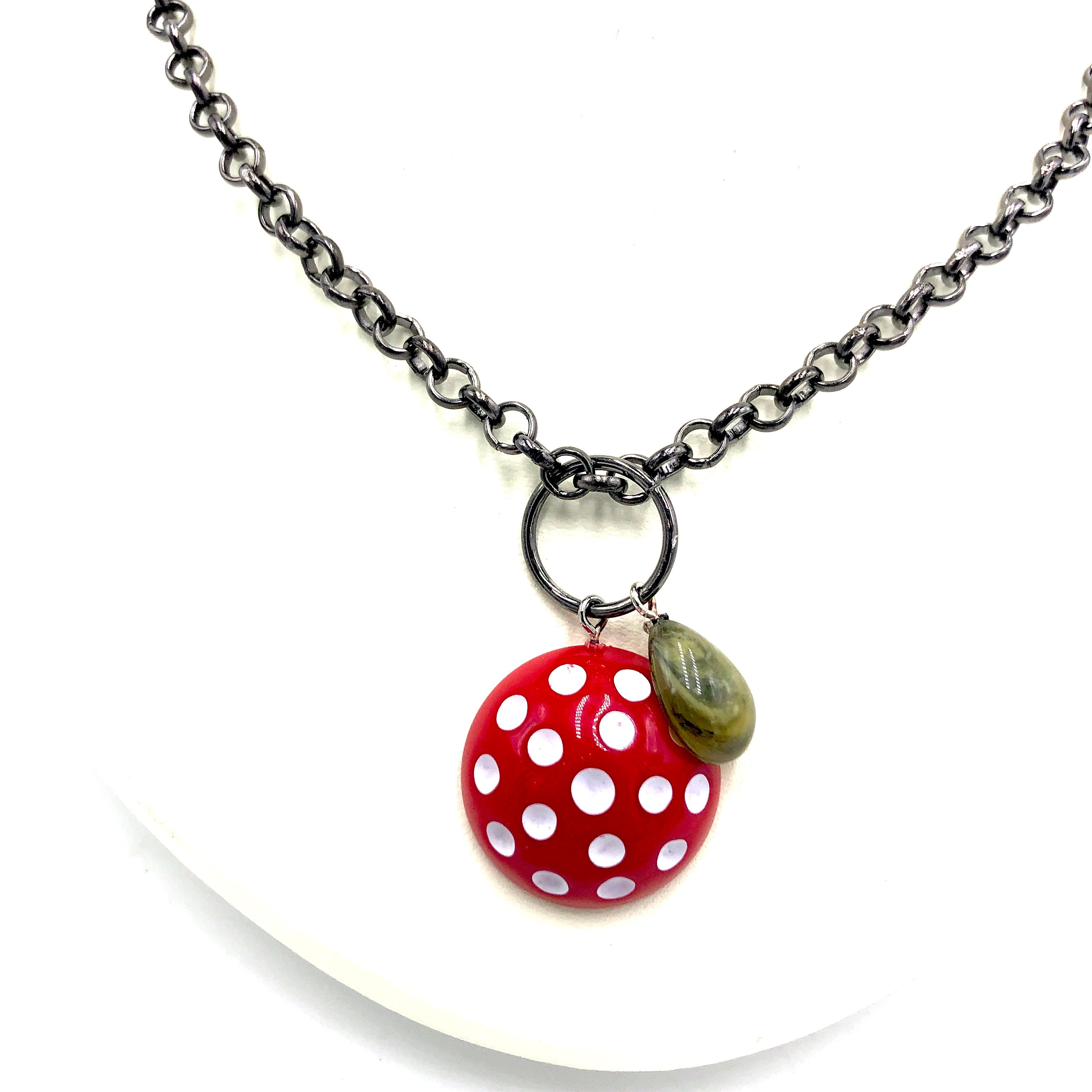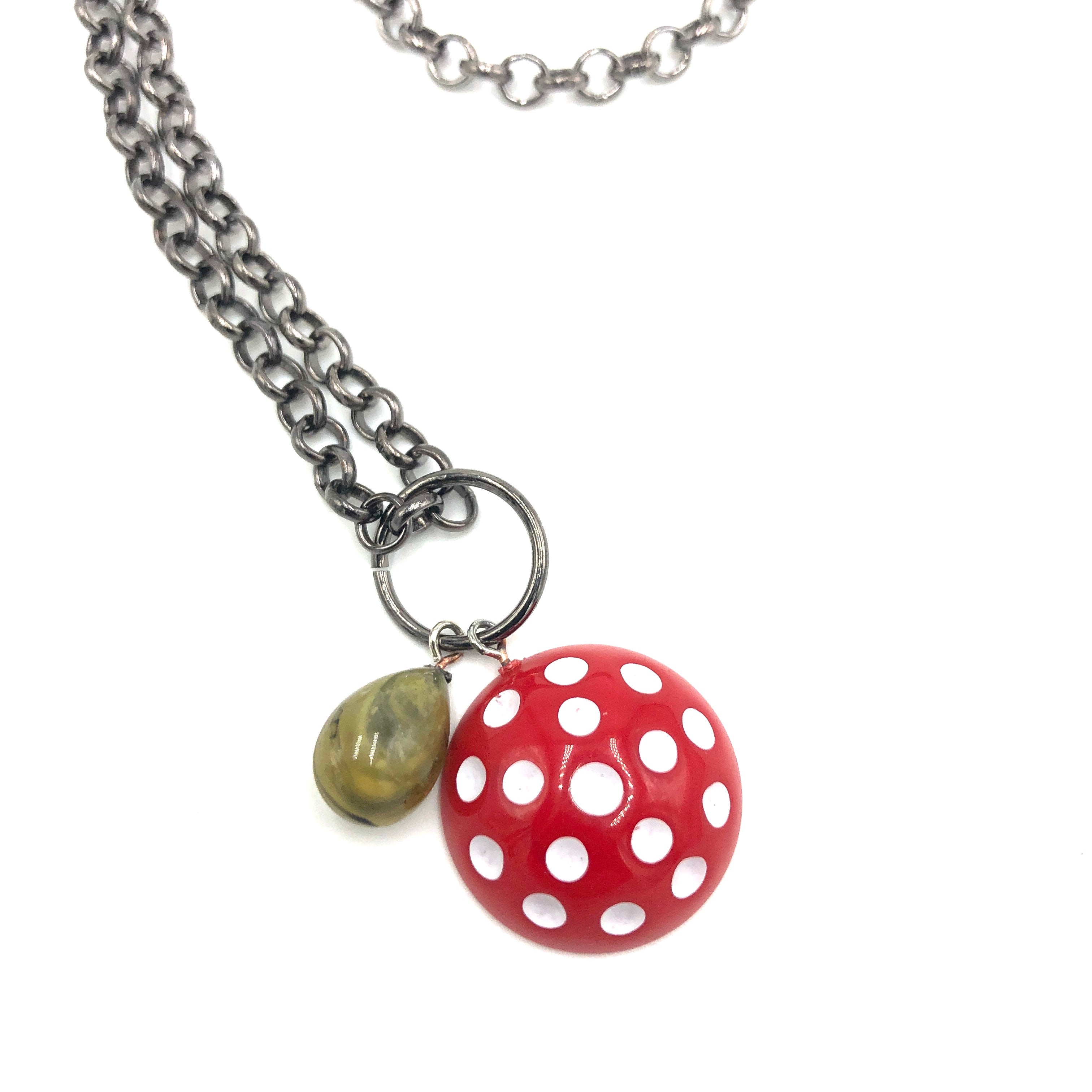 Vintage mushroom cap pendant with a little happy leaf charm make for a cottage-core, retro inspired necklace. Each features gun metal rollo-link chain in an adjustable 24" length and is light-weight and hypoallergenic.
