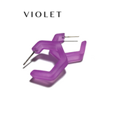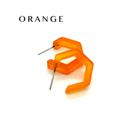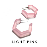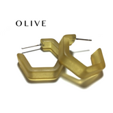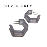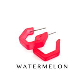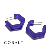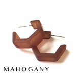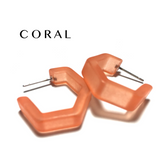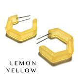 Hoop earrings in a fun and almost faceted hexagon shape known as the Honeycomb Hex Hoop. Unlike other Hex Hoops in our collection, this a straight-edged faceted hoop. Each measures just under 1" and 22mm in diameter x 6mm in width. Available in loads of fun, hand-dyed colors.