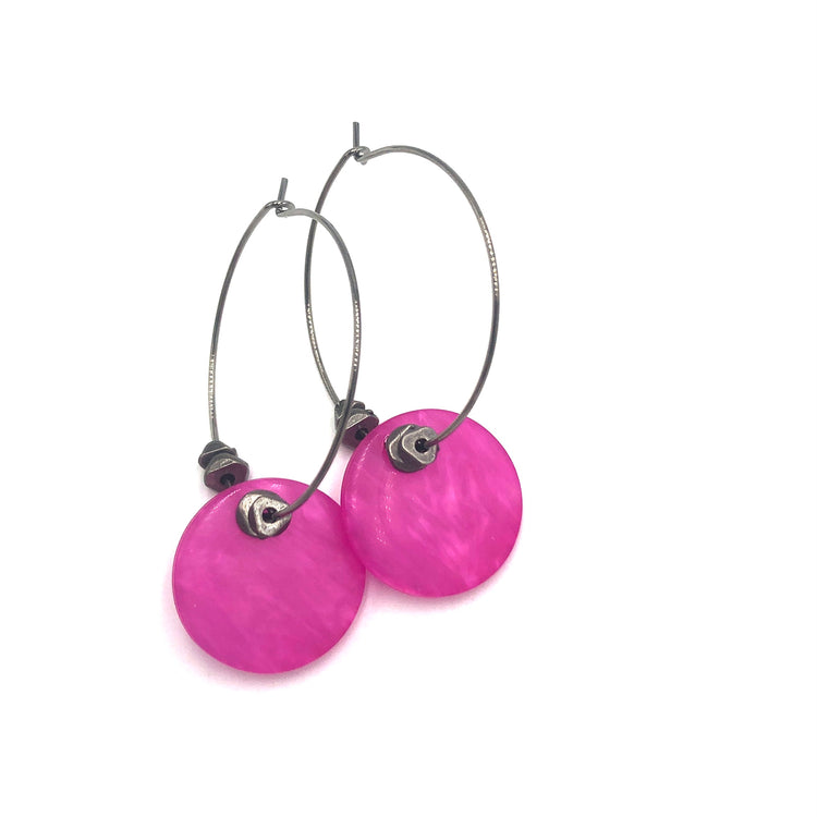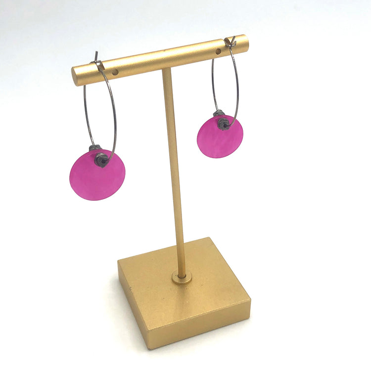 Marbled shell-like discs cascade from frosted 24k gold plated hoops.  This style is lightweight & fun to wear, featuring vintage lucite & hypoallergenic ear wires. This modern & sleek style highlights neutral beige charms with a sturdy yet flexible wires. Statement earrings that are light-weight but make a splash.