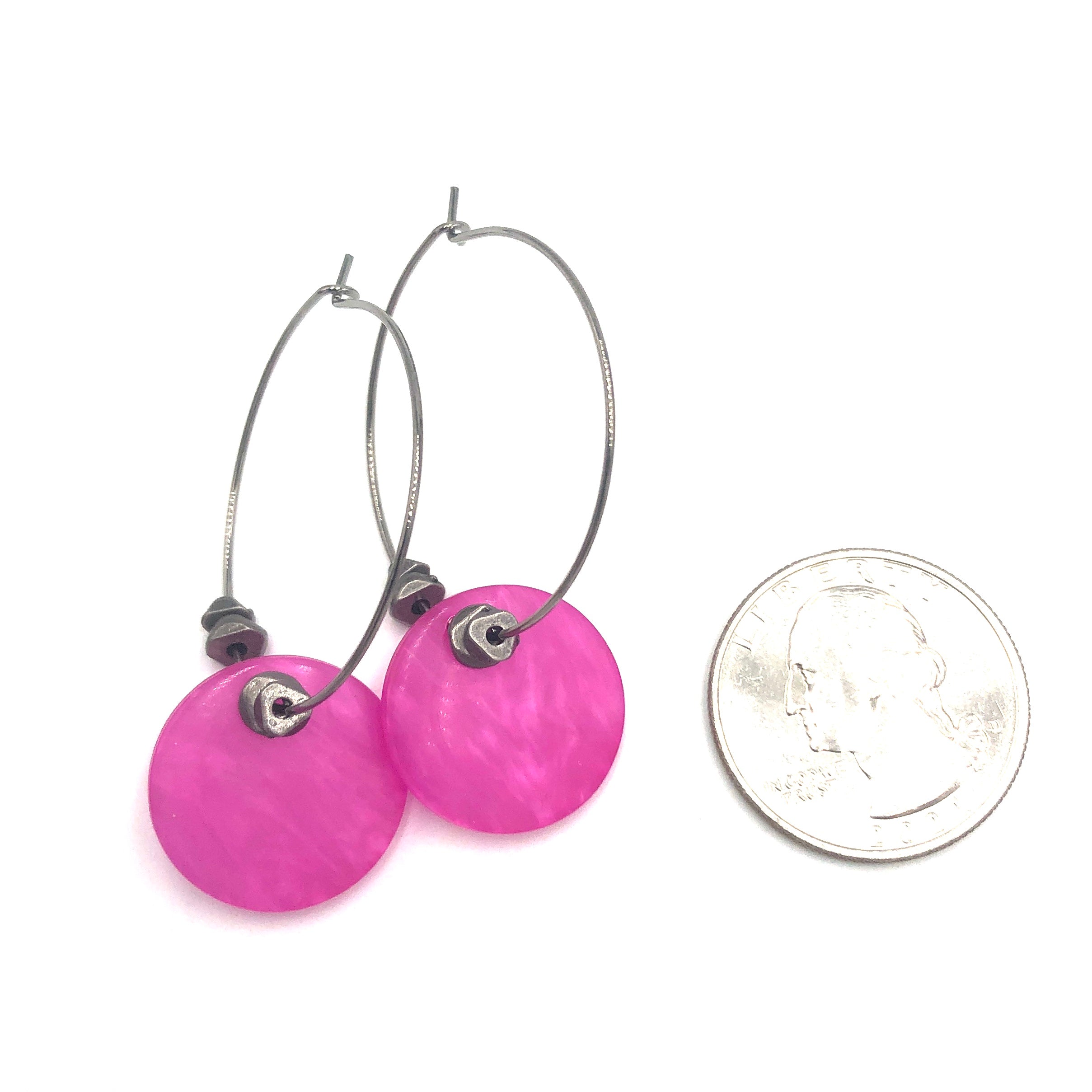 A: For our 'stud' style hoops & post earrings, we use Surgical Steel posts. Dangle & Drop earring styles are hypo-allergenic ear wires, made in the USA with silver, 24k frosted gold or gun metal plating. We are lucky to have thousands of repeat shoppers who love our jewelry because they have sensitive ears & can only wear light weight & surgical steel or hypoallergenic earrings.