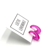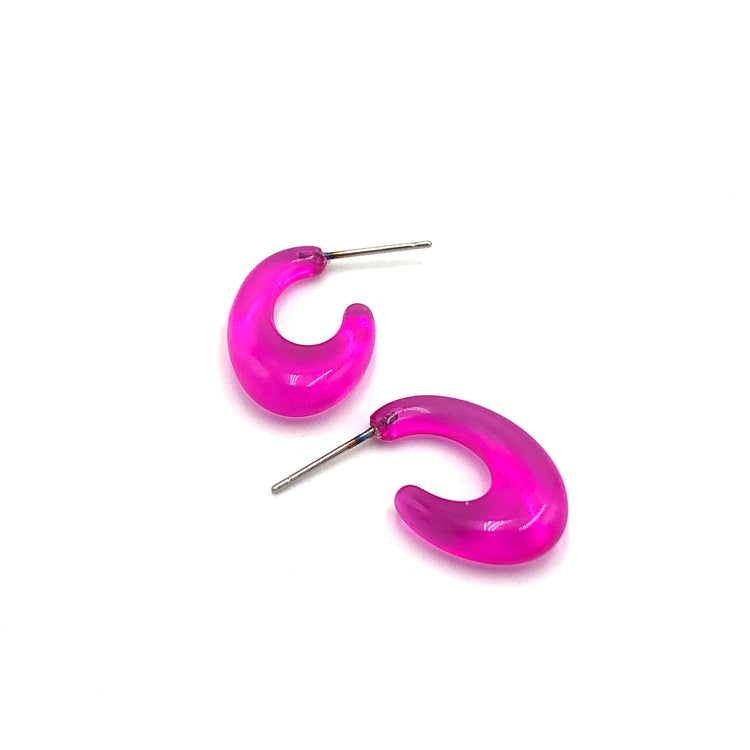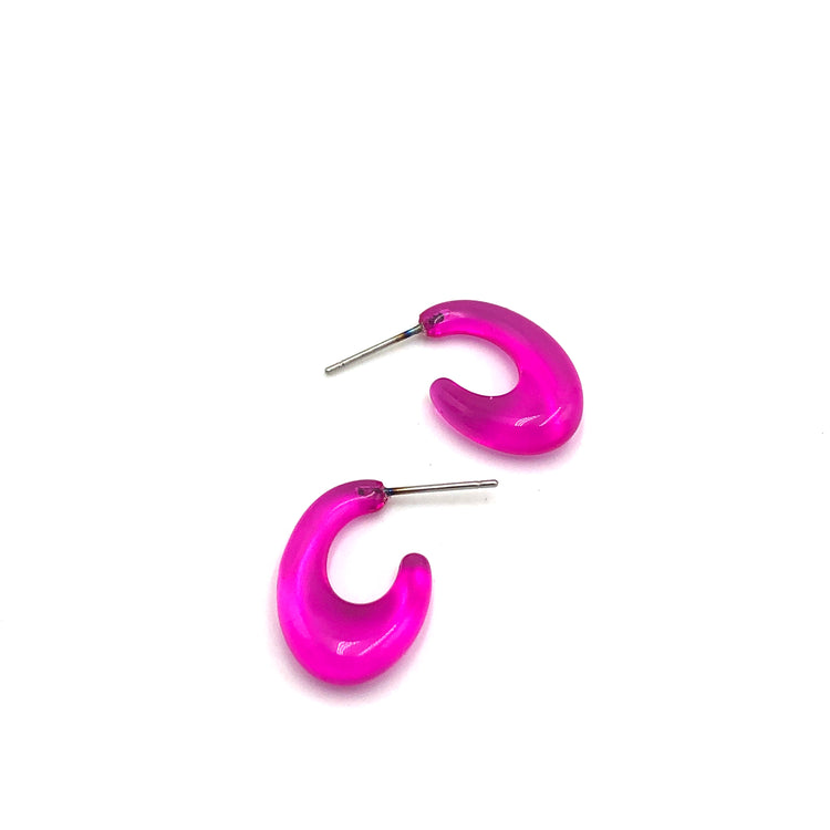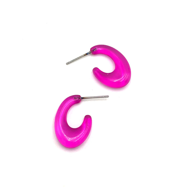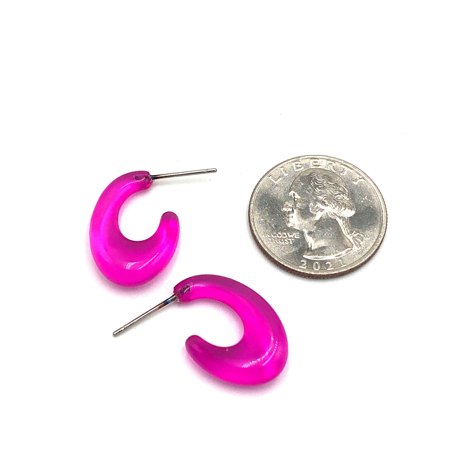 Frisco Hoop Earrings in a perfect narrow oval shape. Made with vintage lucite, each is just under 1" long or measures 23mm in length by 15mm in width. Super retro, organic shape, these are a light-weight earring set by hand with surgical steel. We unearthed these vintage plastics in Europe & finish them off in our AZ studio.