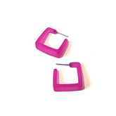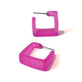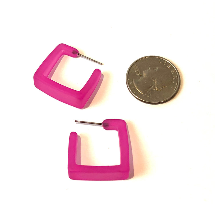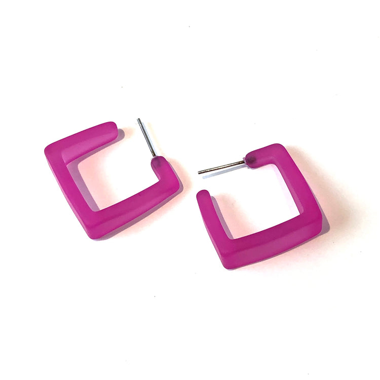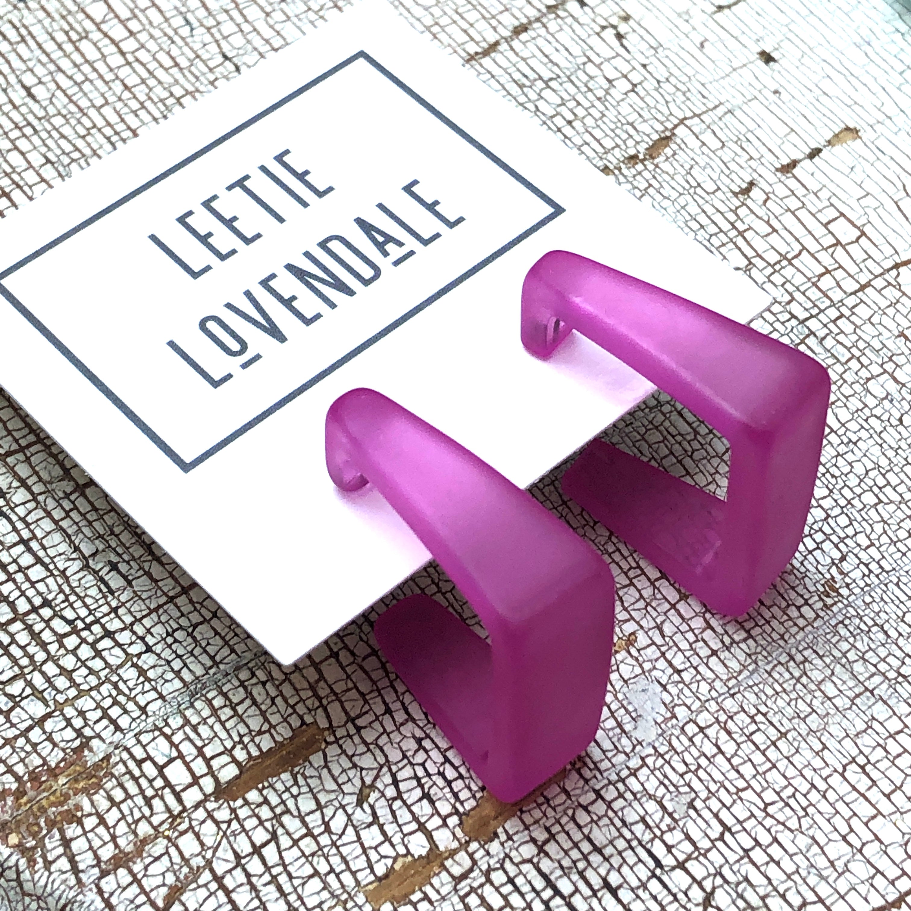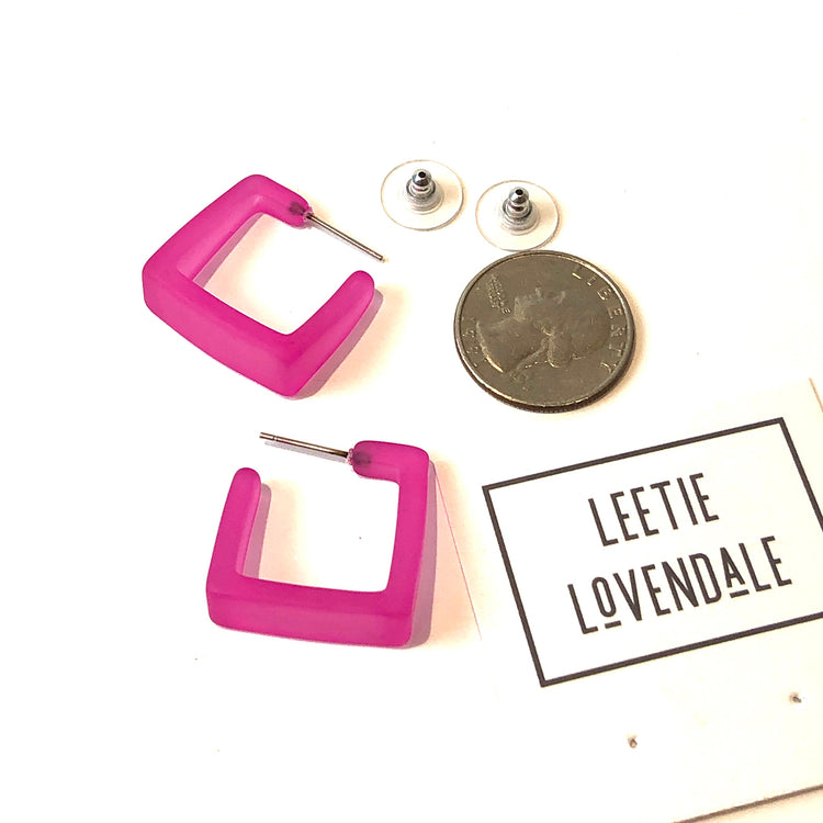 Get ready to jazz up your style with these Cubist Hoop Earrings! These vibrant geometric earrings feature a sleek, tapered design and a frosted finish. Each square hoop has a diameter of 1" or 25mm, adding a touch of minimalist cool to your look. Made with vintage lucite parts from the 1960's to early 80's, they're set with surgical steel earring posts and come with sturdy surgical steel/acrylic backings. Plus, they're lightweight and oh-so-fun to wear!