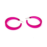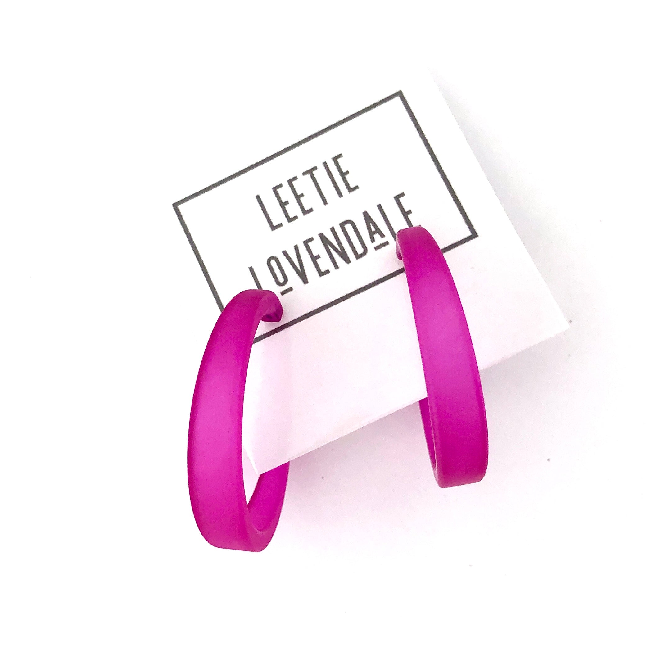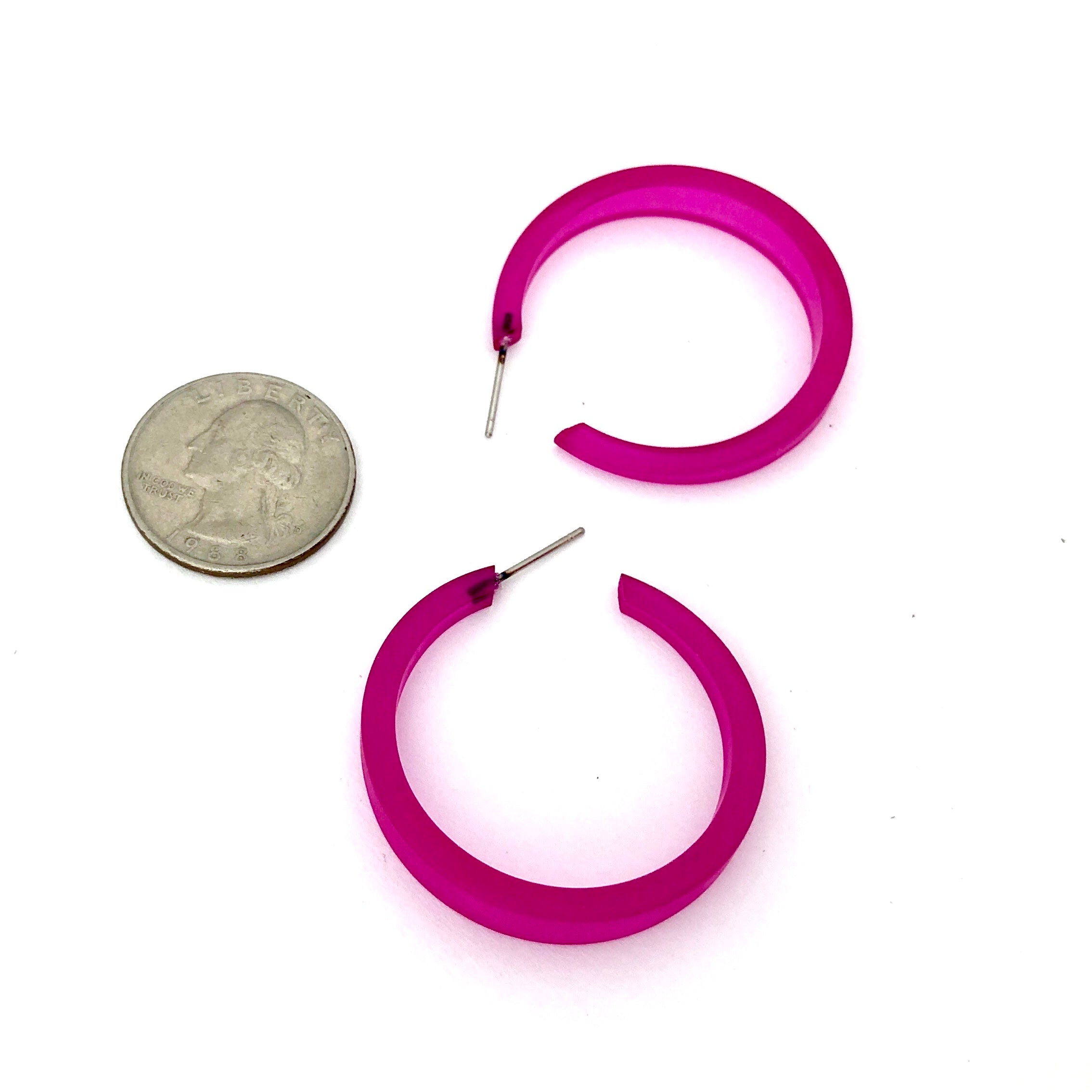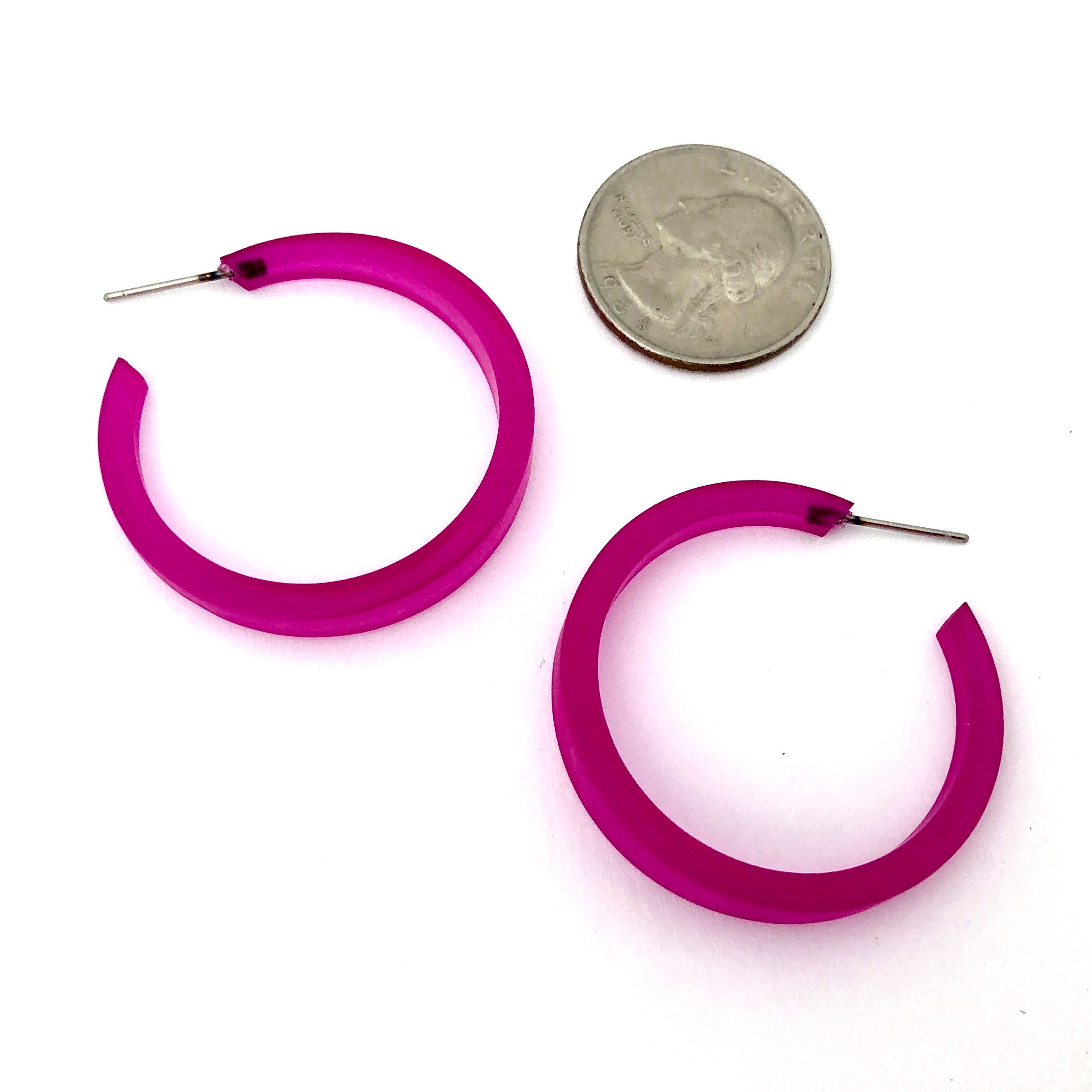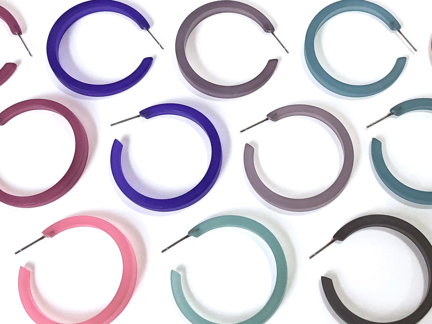 Frosted hoop earrings in a finely shaped & tapered hoop shape that measures approximately 1.5" or 37mm in diameter and 7mm at the widest. This style is known as the Phoenix Hoop. This finish is so super popular and this is one of the most popular colors in the line. The finish is lucite but it resembles sea glass.