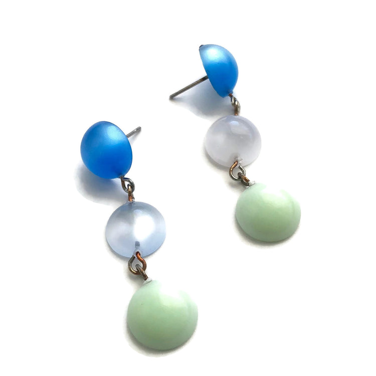 Aqua blue, ice silver blue & mint green with a retro moonglow finish & color story. Triple domed discs connected with steel wire creating retro fantastic statement earrings.