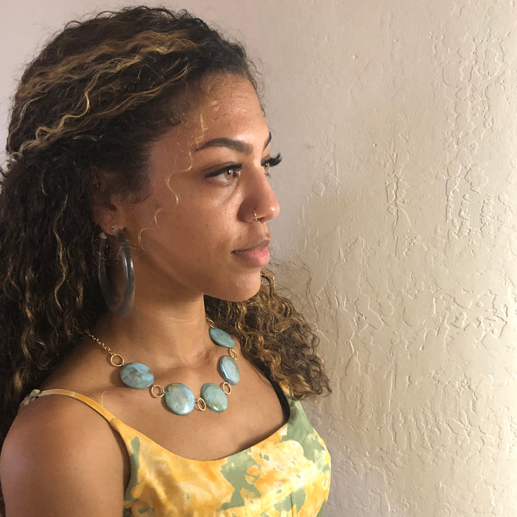 Ice blue marbled acrylic links are the highlight of this piece. This subtle golden beige color that rights through the bright pastel blue is just incredible. Paired with 24k frosted gold OR gun metal plated components, this piece measures adjustable to 24". Perfect for layering, this necklace is light weight with a chunky look.
