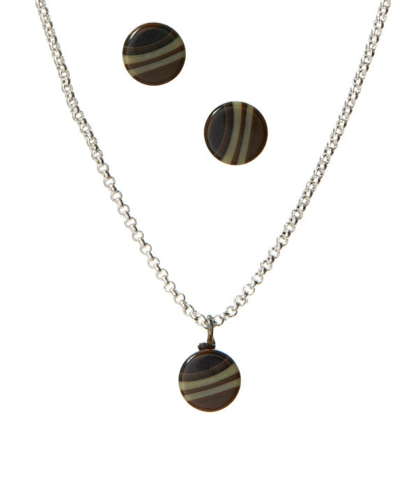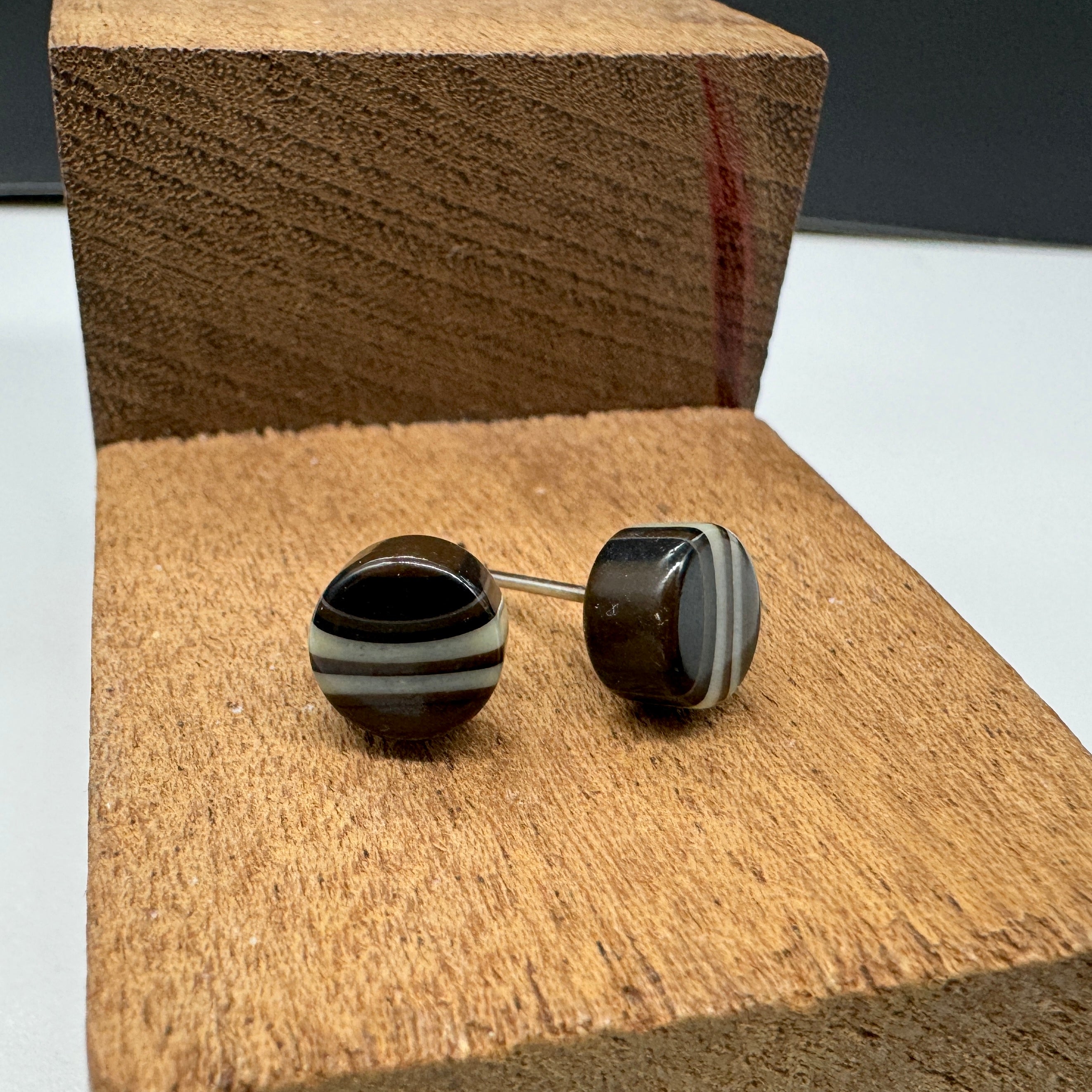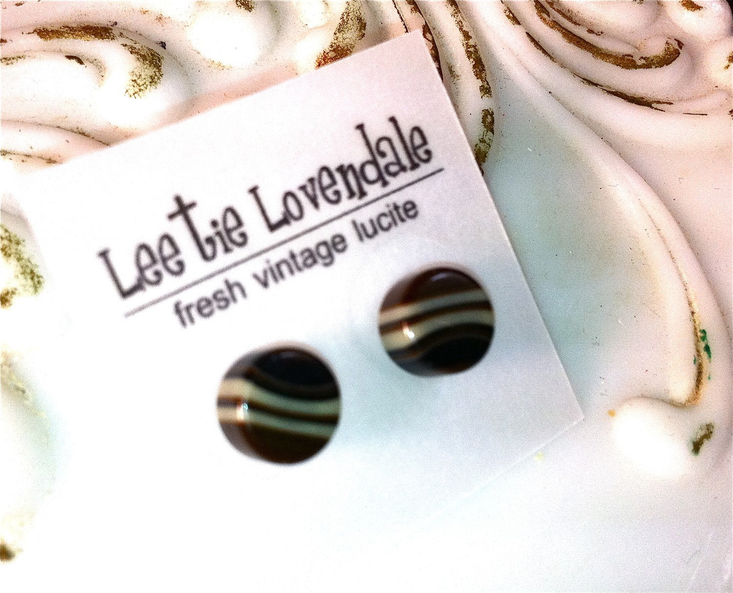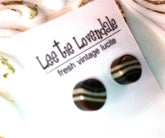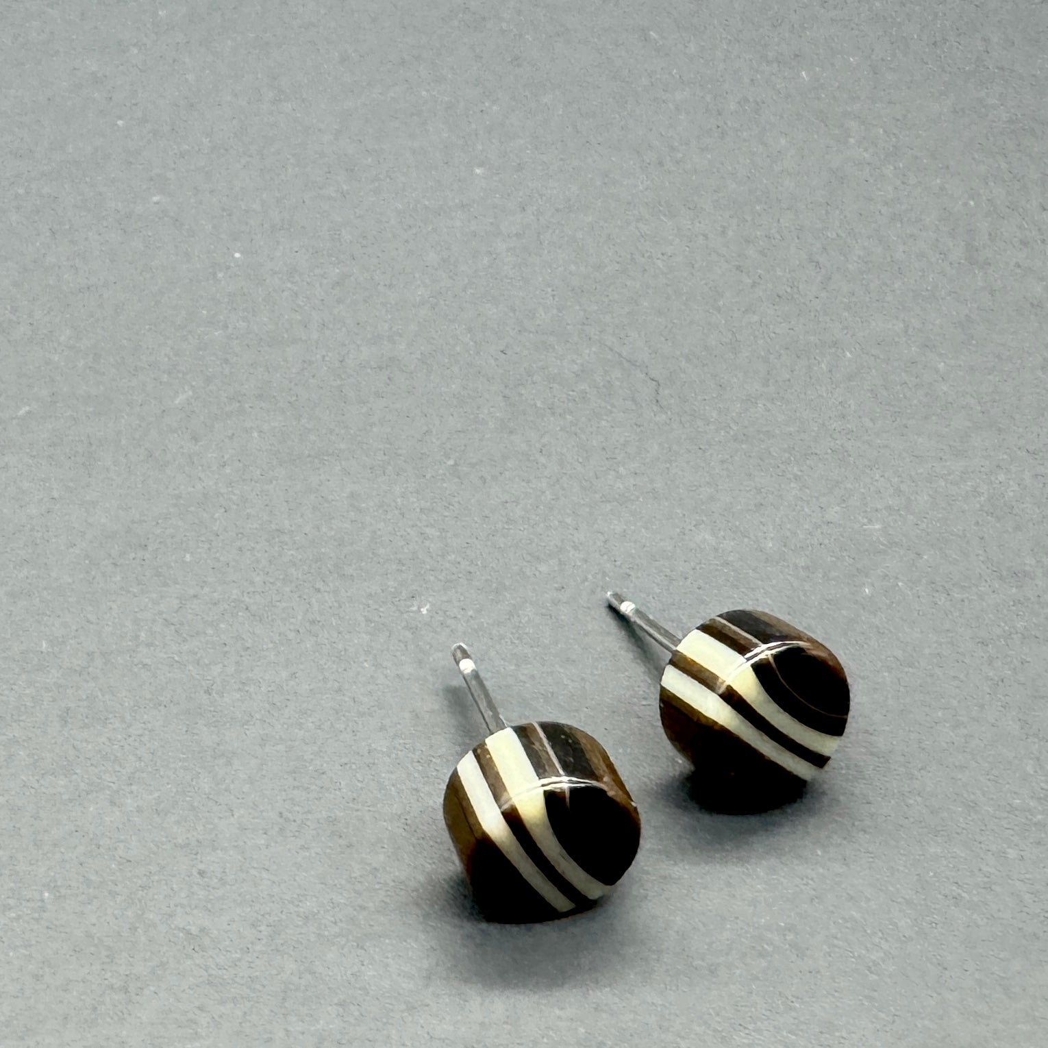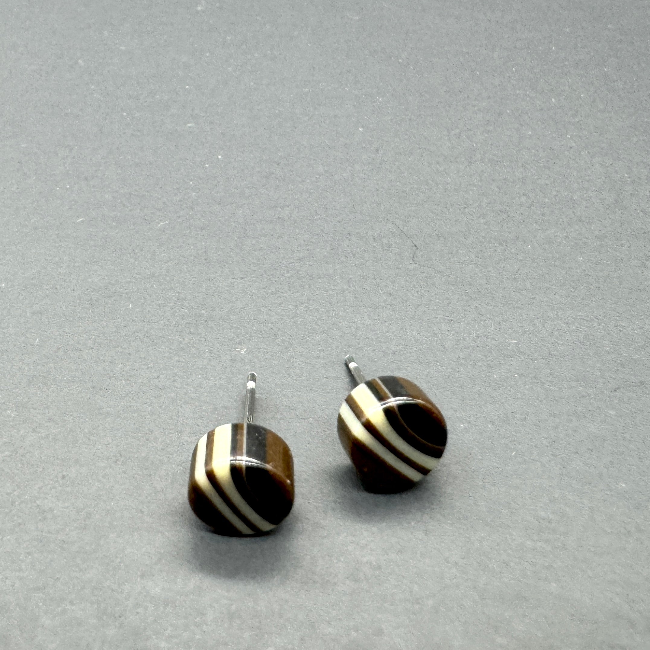 Black and tan striped disc stud earrings. Darling size post earrings in brow, black & tan swirled plastics. This is the pair of earrings that goes with every outfit. Each measures 8mm in diameter.