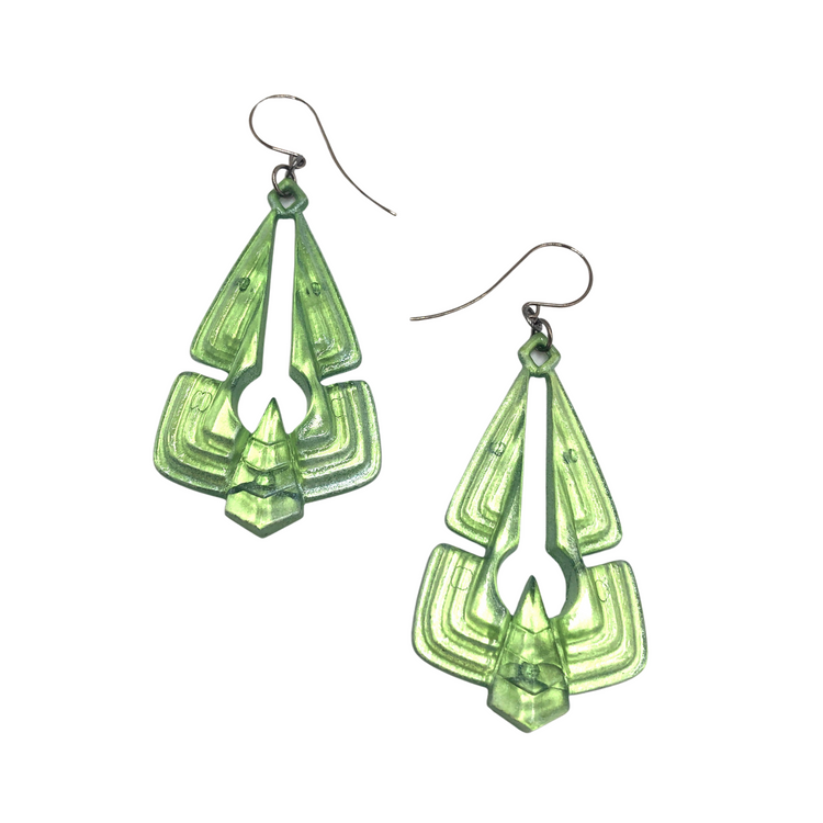 Green lucite earrings with a silver pearlized coating on one side, adding an over all glow to their finish. A style statement that looks and feels good, these earrings are crafted using only the highest quality materials in an effort to bring you a timeless piece you can show off with confidence.