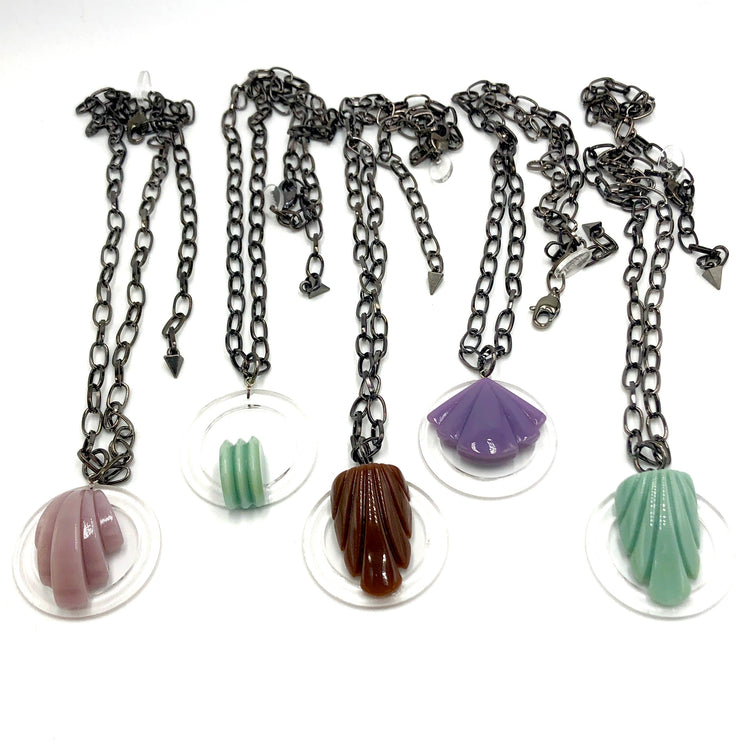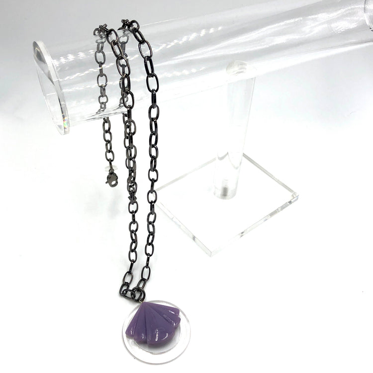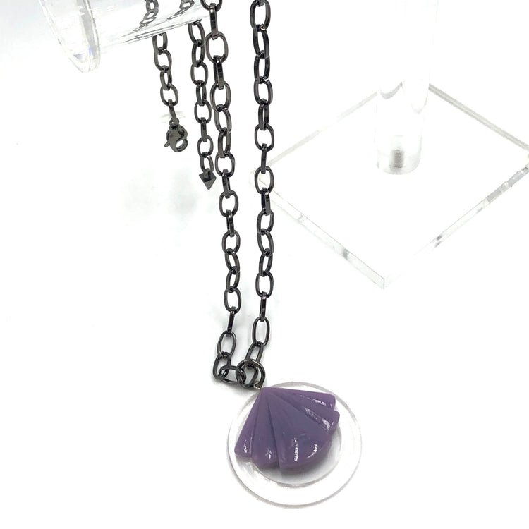Lavender purple carved resin pendant meets an epic hammered gunmetal chain necklace. A limited piece from our Trinket Necklace collection. Vintage lucite parts from the 1960's stacked up with contemporary resin reproductions and paired with fine chain. The chain is hypoallergenic gunmetal & in a flat link style.
