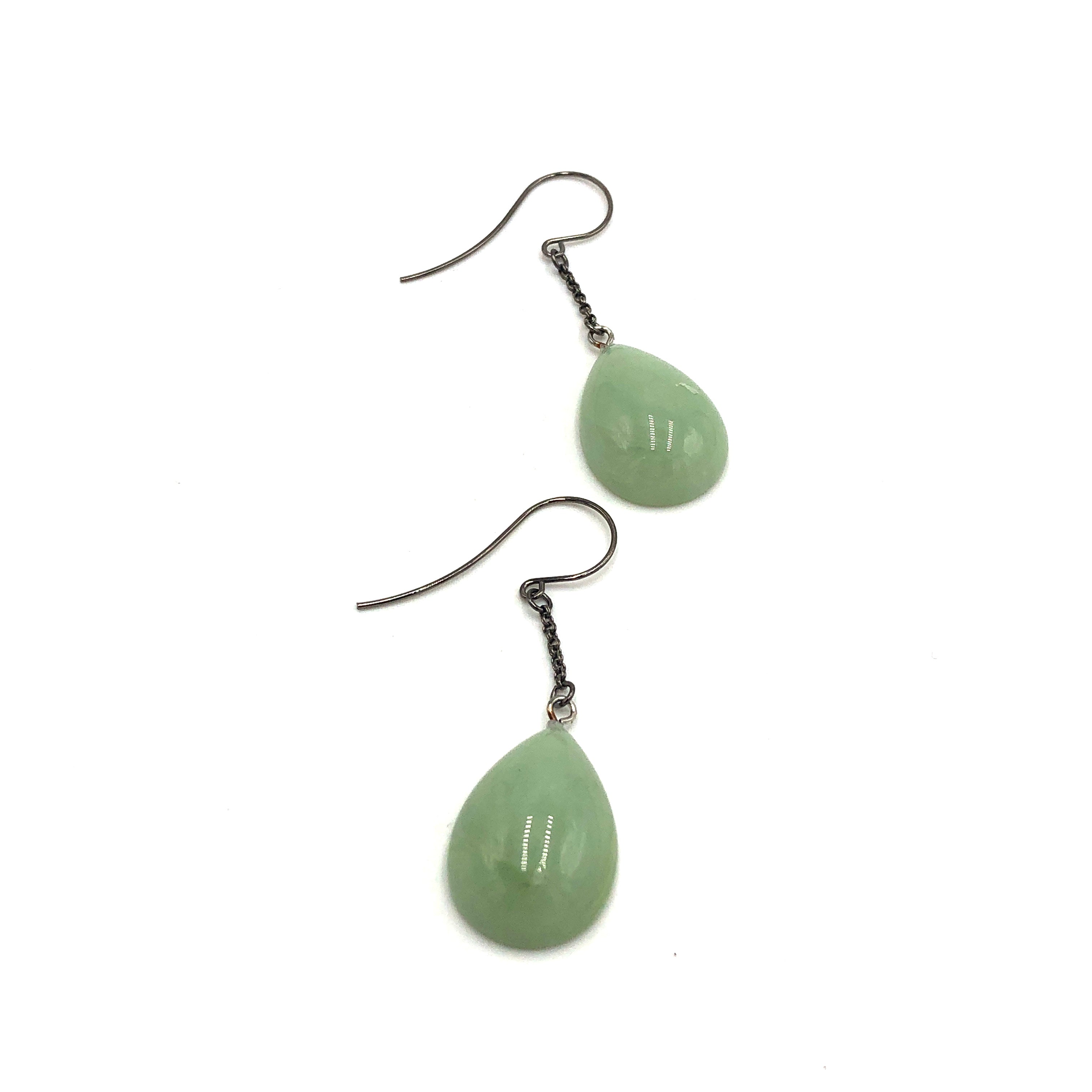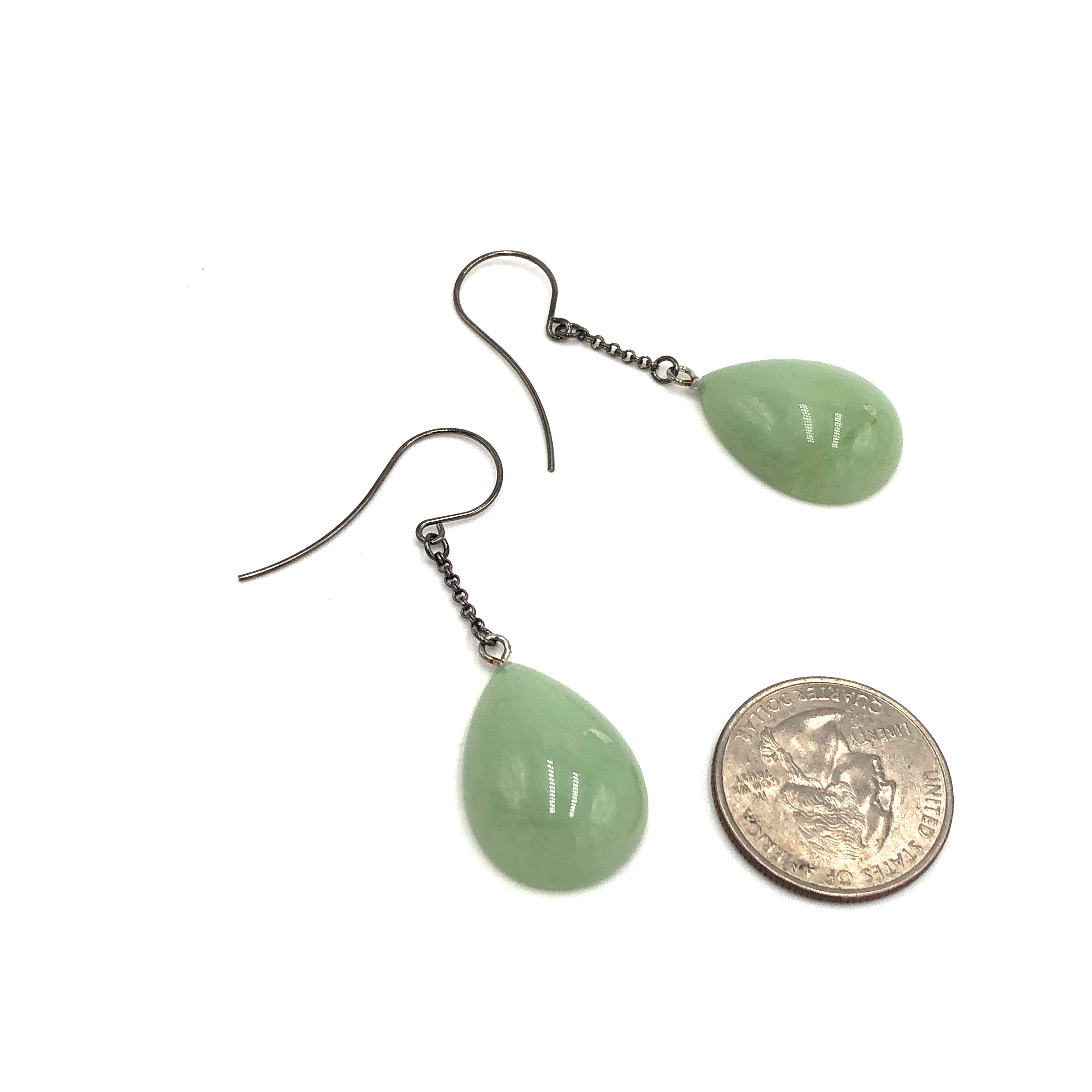 Marbled light jade green pear-shaped drops hang from fine tiny rollo chain links. Each earring measures just about 2.25" inches in length. Each teardrop shape is made with vintage lucite from the 1980's. These are on gun metal hypoallergenic earwires. A style statement that looks and feels good, these earrings are crafted using only the highest quality materials in an effort to bring you a timeless piece you can show off with confidence. Made with vintage components here in the US.