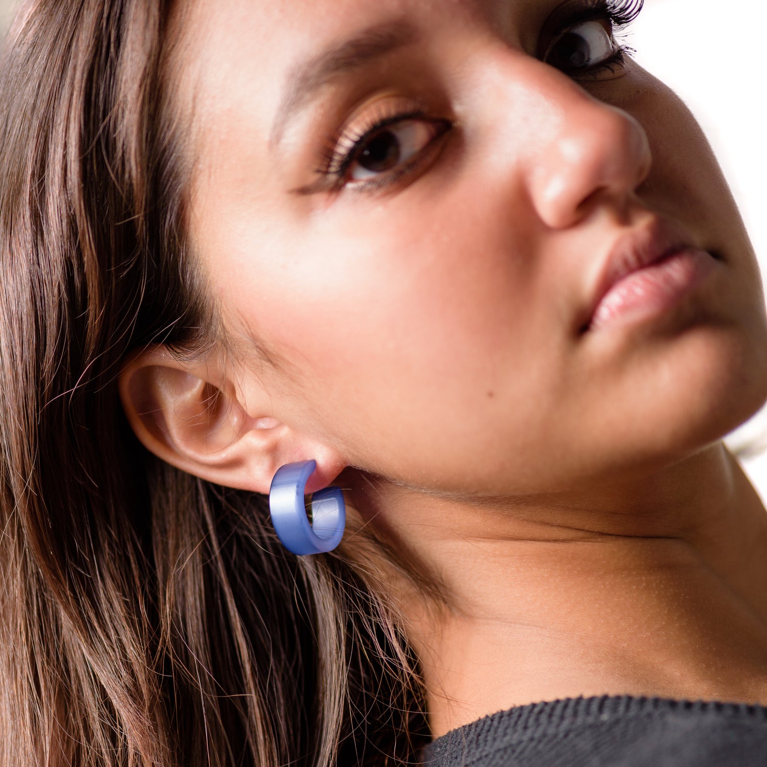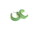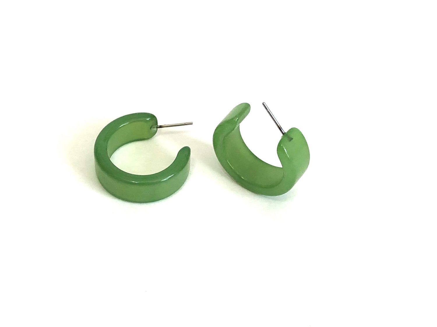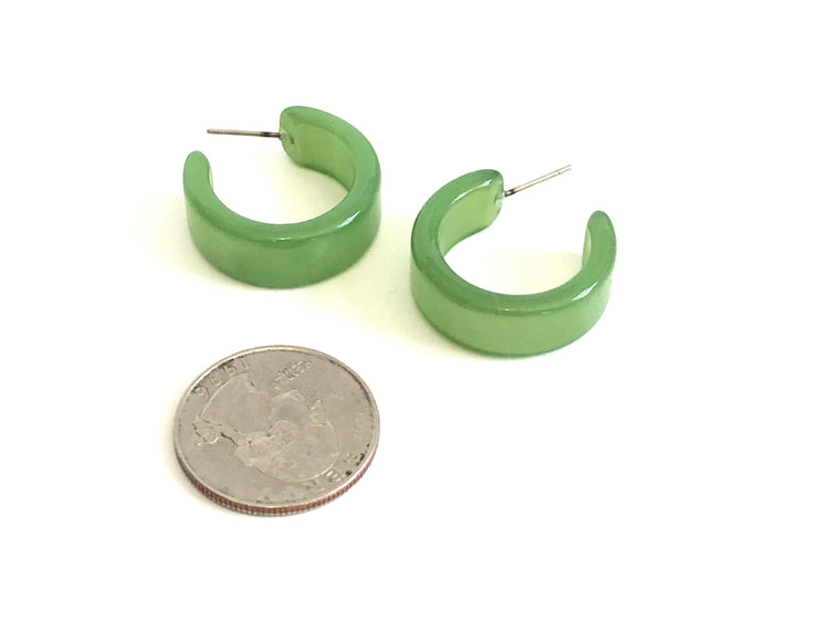 Hoop earrings with a retro moonglow finish & made with vintage plastics. This style is known as the Clara Hoop, previously known as the Wide Classic Hoop style. Each measures approximately 1" in diameter and about 15mm in width.