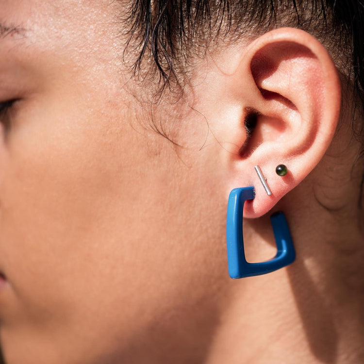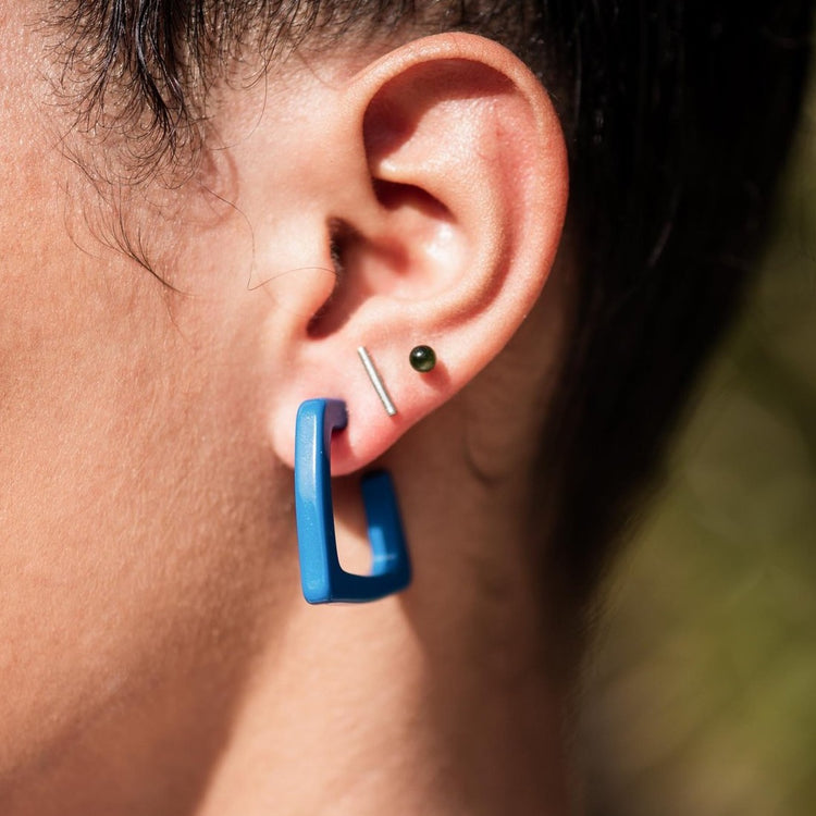 Angled geometric hoop earring measuring approximately 1.2" or 28mm in length & in an opaque shiny finish. Geometric & simple, retro- styled earrings hand-set with surgical steel posts. Light weight & made with vintage goods. Model is wearing the same style in another color.