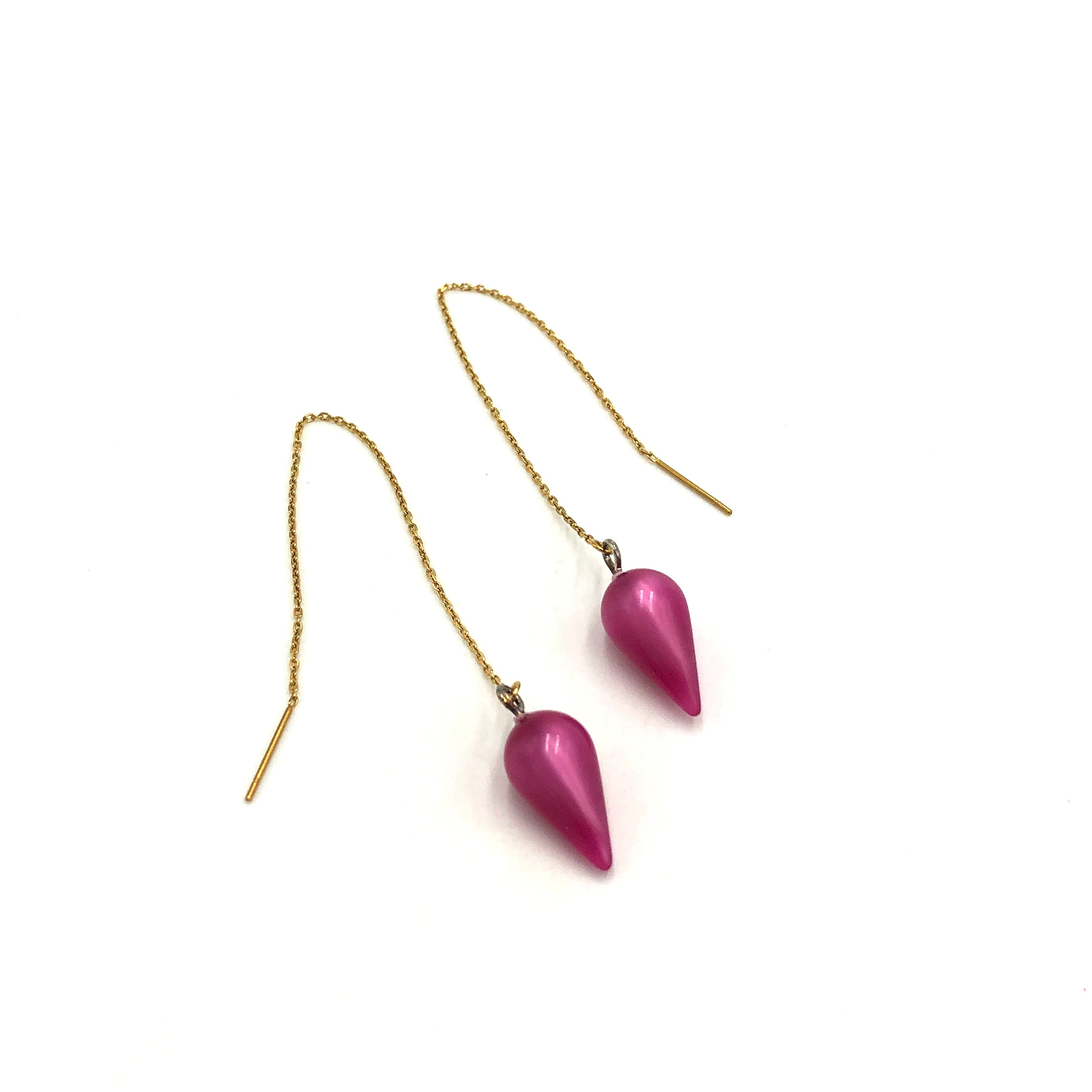 Magenta moonglow threader drop earrings feature thread-fine chain and 1960's lucite spike-shaped charms. Each measures 2.5" at the halfway mark when worn, or you can adjust them to be longer or shorter depending on where you adjust the threader. Weave into other piercings or style as you like.