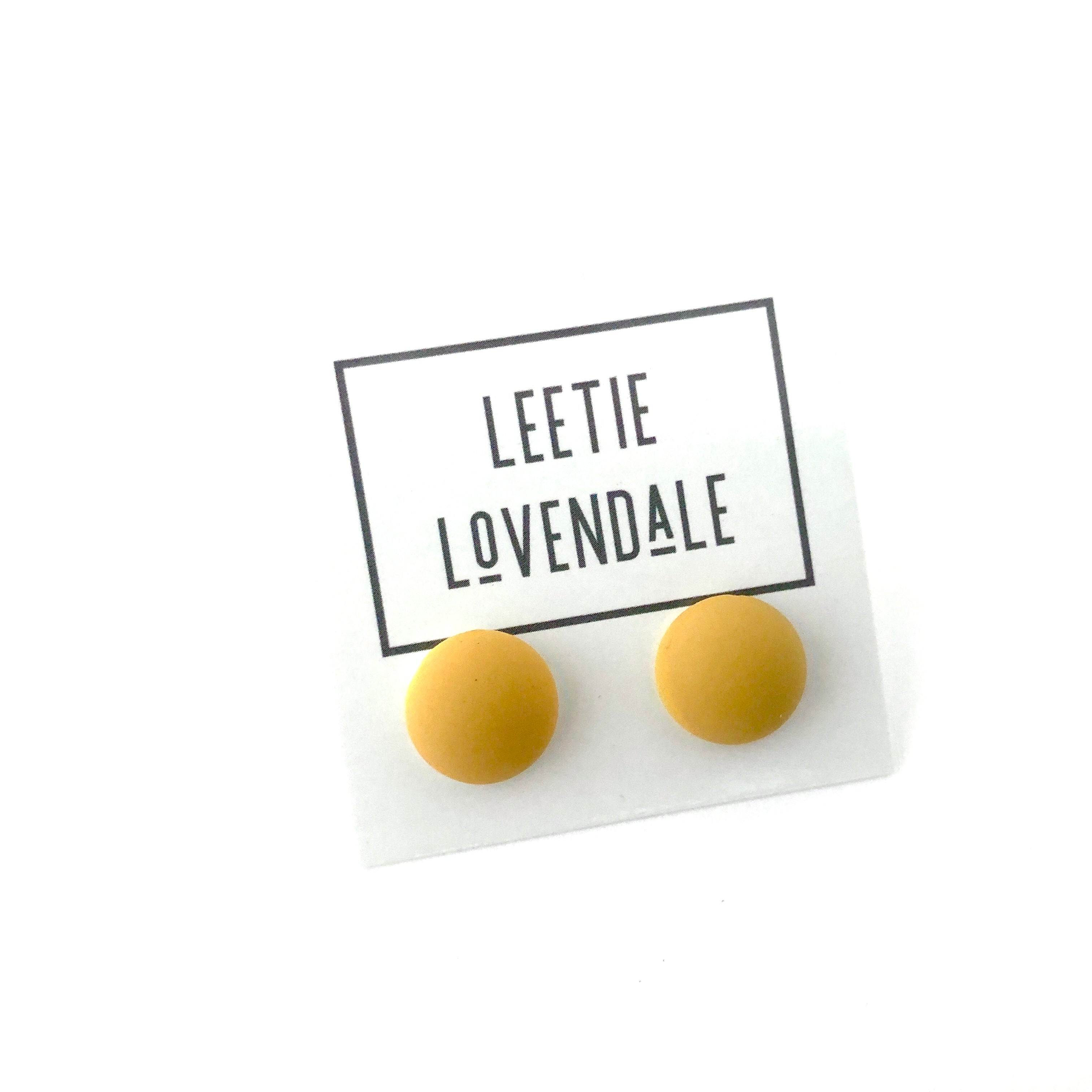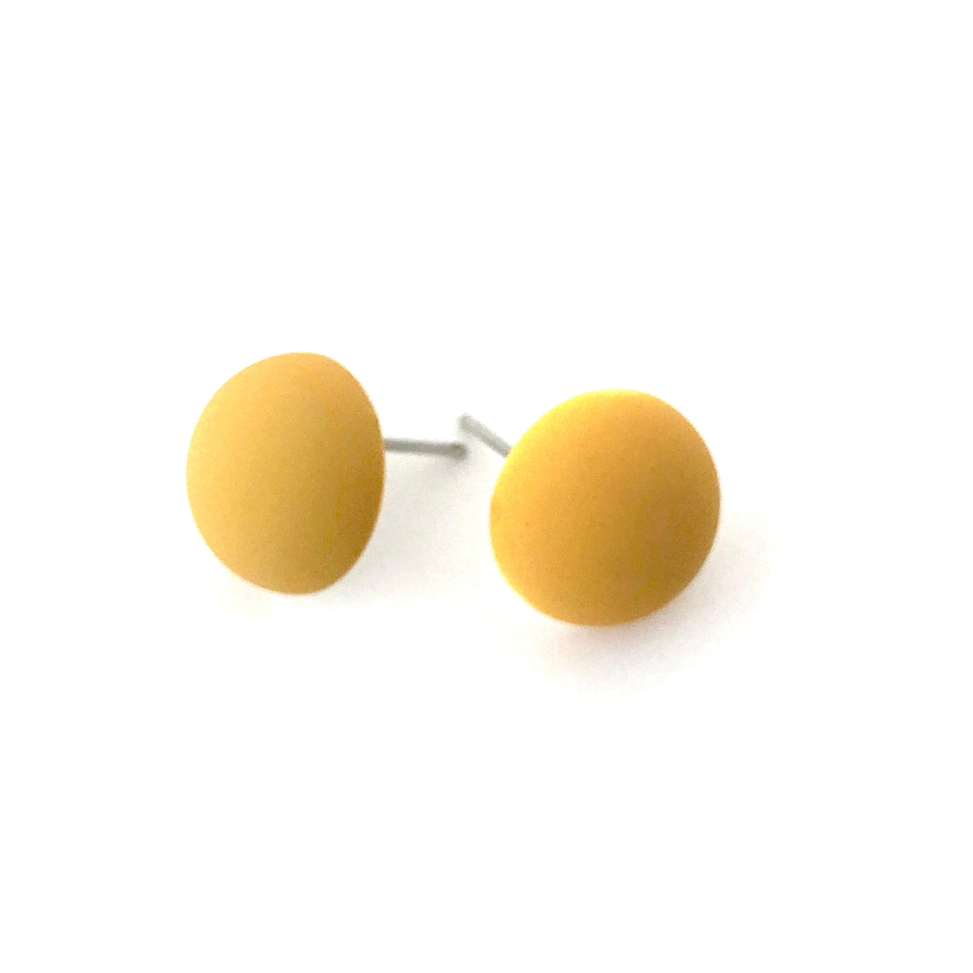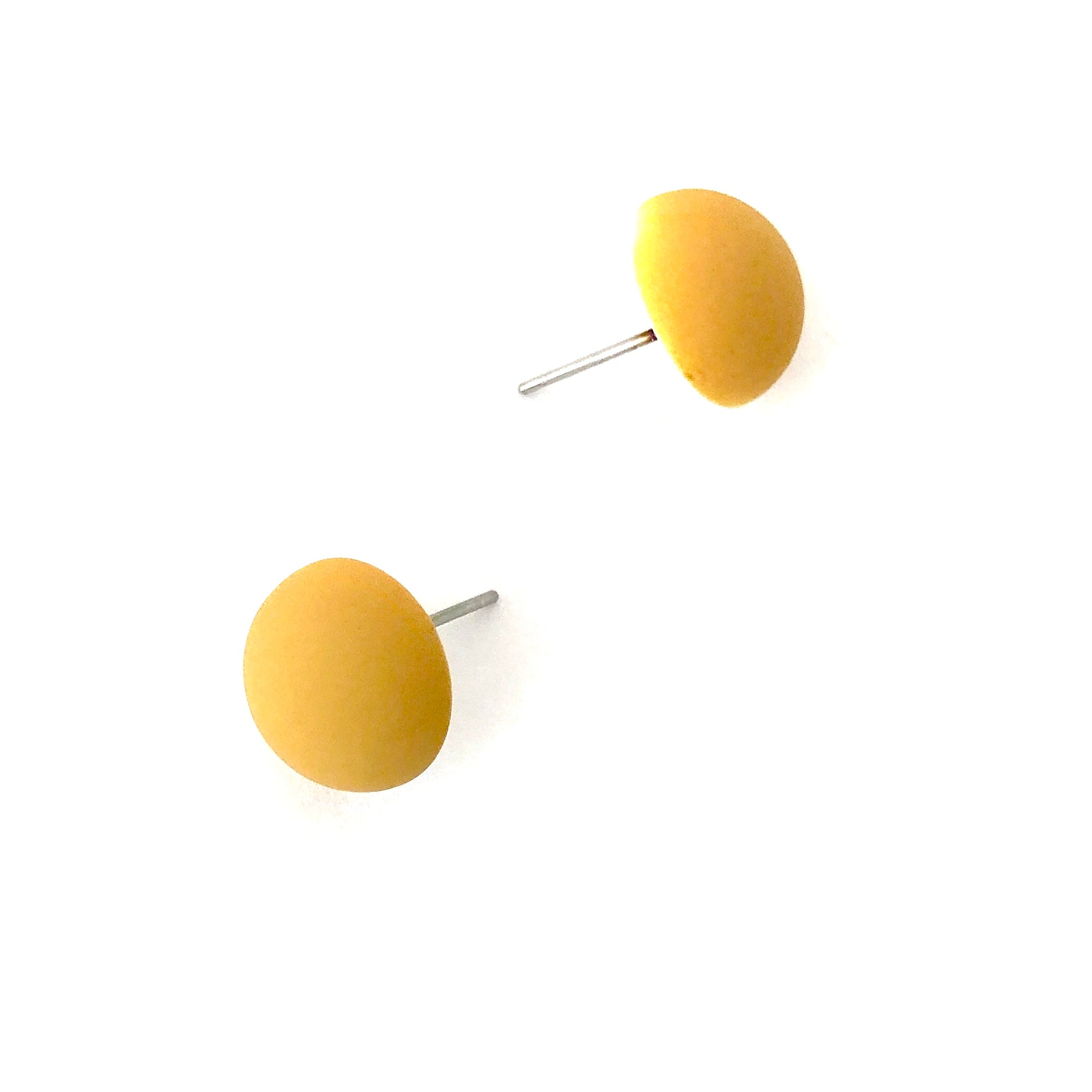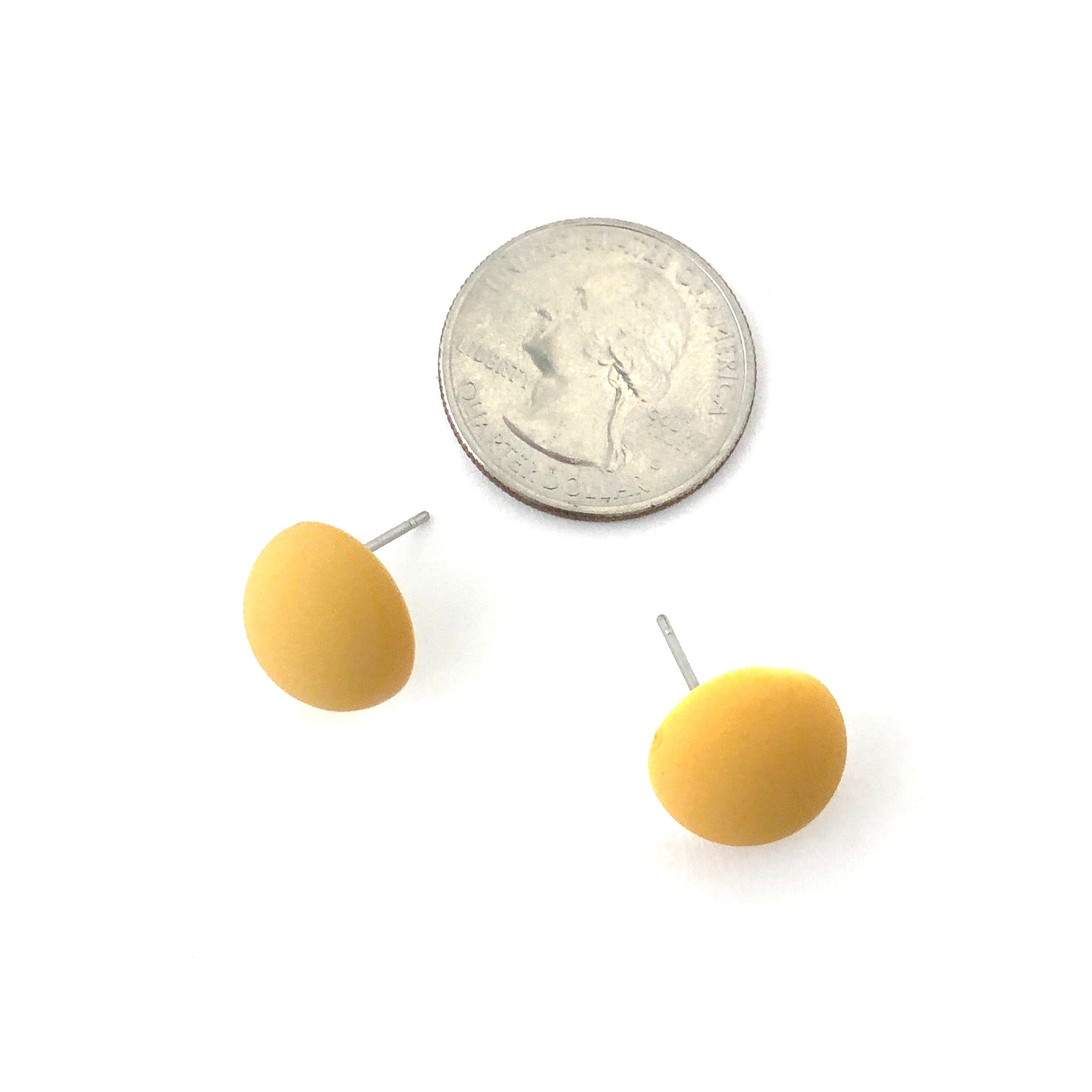 Mustard yellow domed studs in a great velvety, matte lucite. This is the 'Retro Button Stud' style & is a domed button with a flat back. This pair measures about 1/2" or 14mm in diameter.
