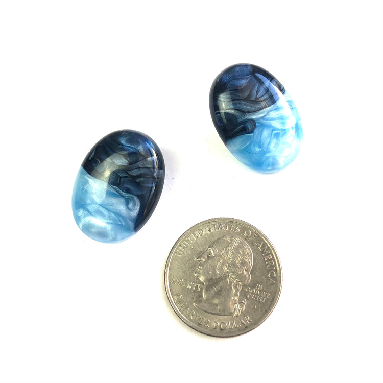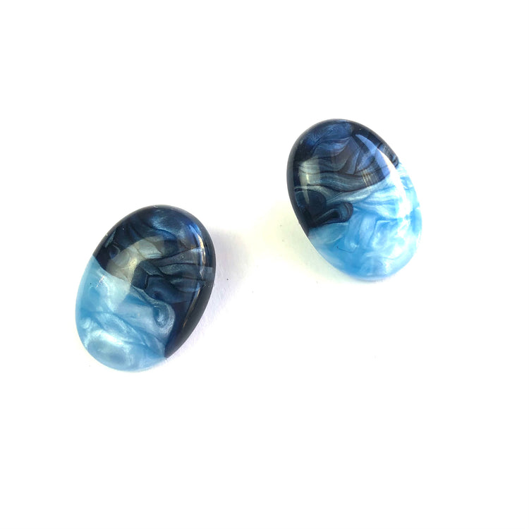 Navy blue meets aqua blue in these beautiful, enamel-style, oval-shaped earrings with a floral motif. They remind me of a spilled bottle of enamel nail polish with their marbled aura glow. Each measures just about 18x24mm, these stud earrings are the perfect size and style to make a statement.