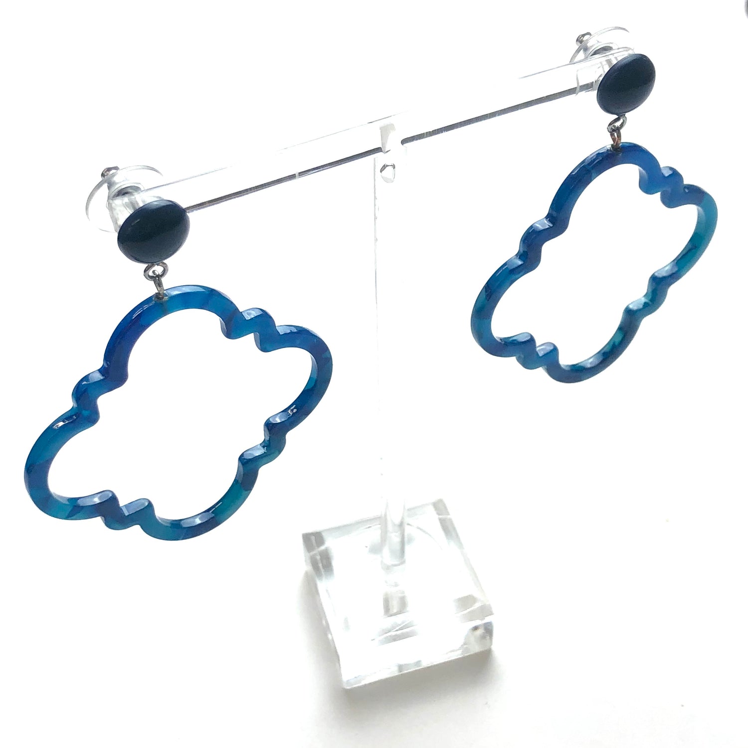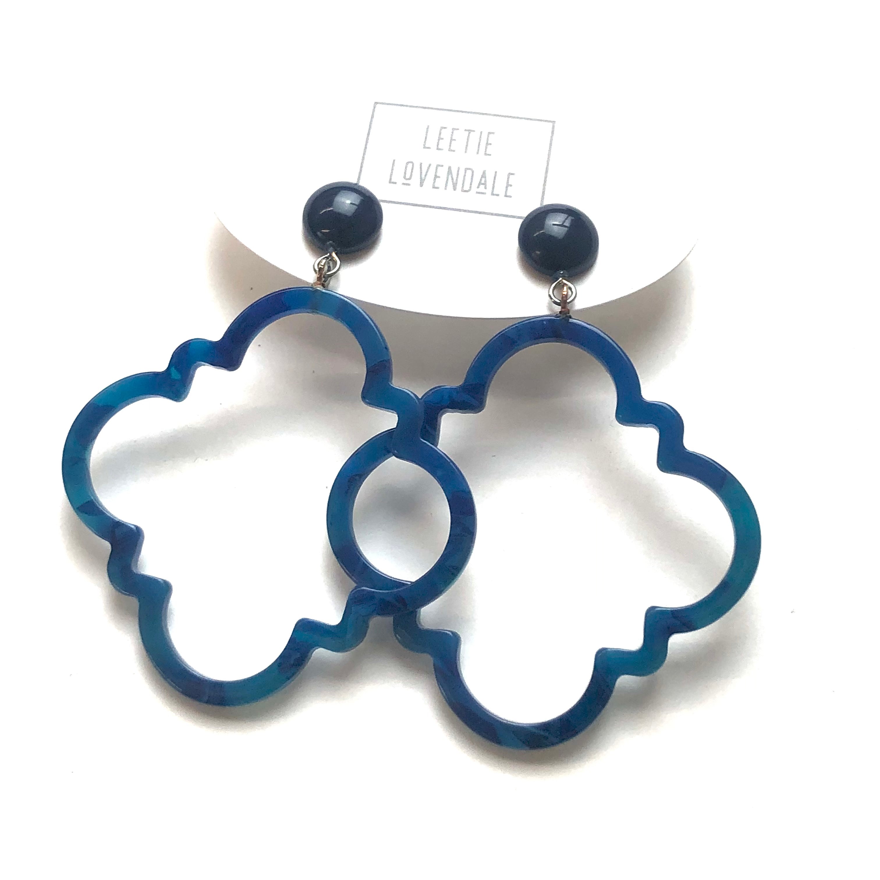 Navy blue quatrefoil laser cut pieces cascade down from a vintage lucite marbled turquoise stud earring. Geometric lucite & resin earrings made with vintage and contemporary parts. These are a great size & light weight, measuring about 68mm or just under 2.75" in length from end to end. The model is wearing the Black & White Marbled version of the earrings.