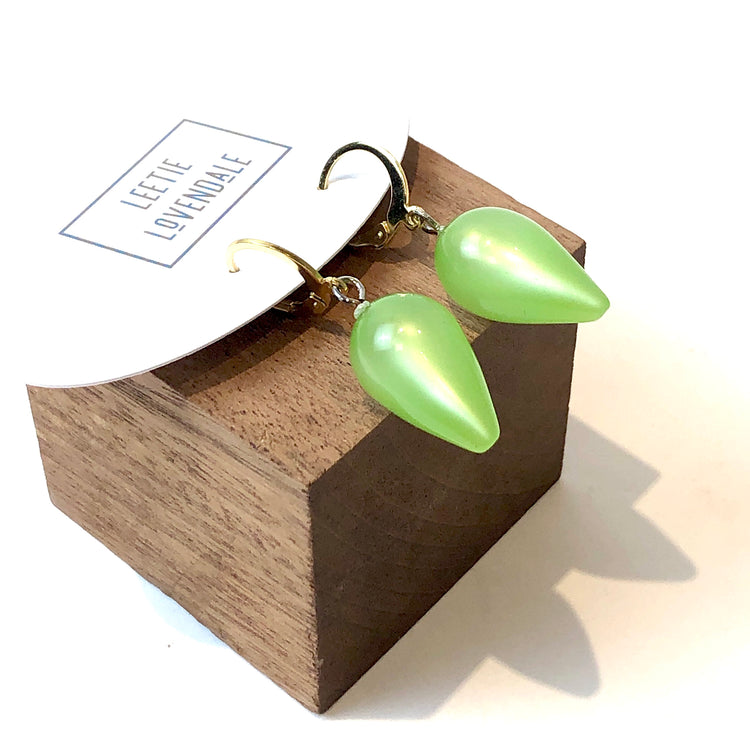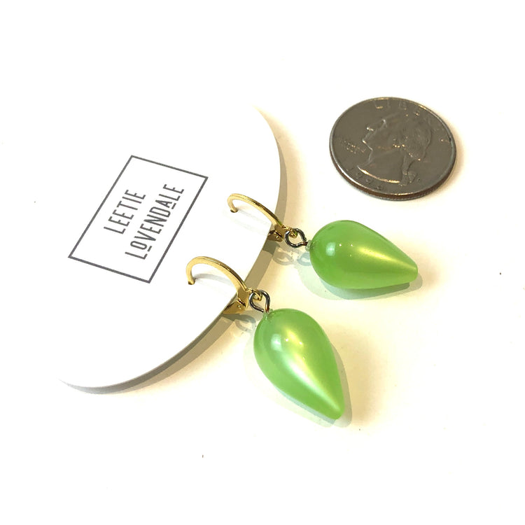 Mint green moonglow spike drops, cascading from cuff-shaped leverback hoops. This is the larger size, Mondo spike shape. Each earring measures about 1.5" in length total. The cuff hoop measures about 14mm in diameter.