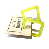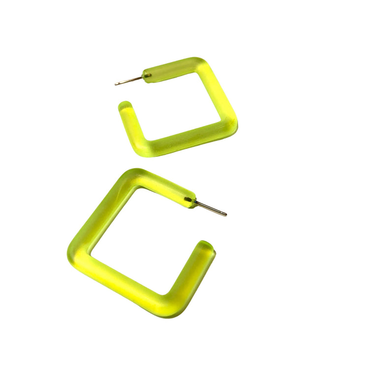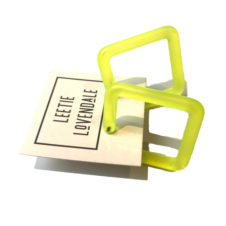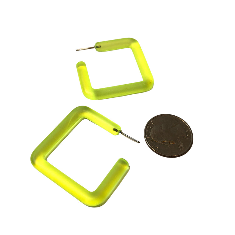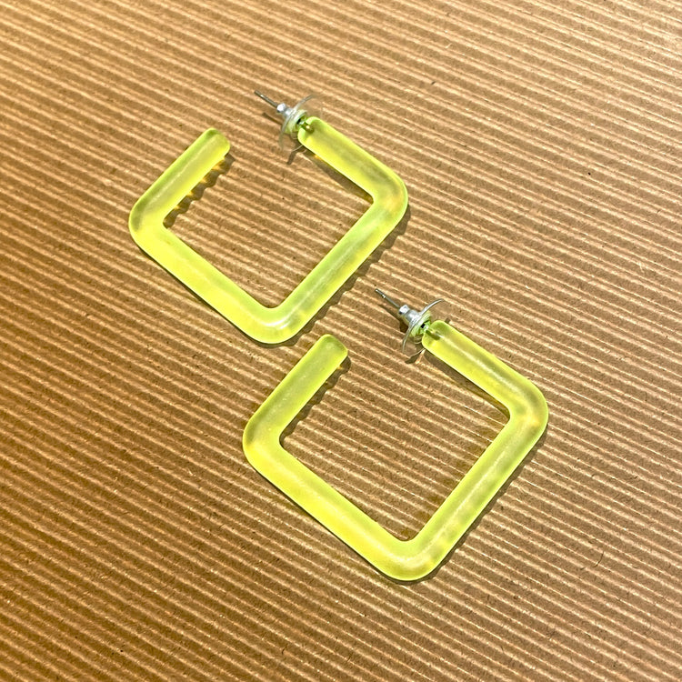 Square quadrangle hoop measuring approximately 1.6" or 40mm in diameter in a transparent shiny finish. Geometric & simple, retro- styled earrings hand-set with surgical steel posts. Light weight & made with vintage goods.