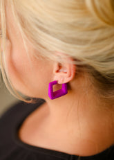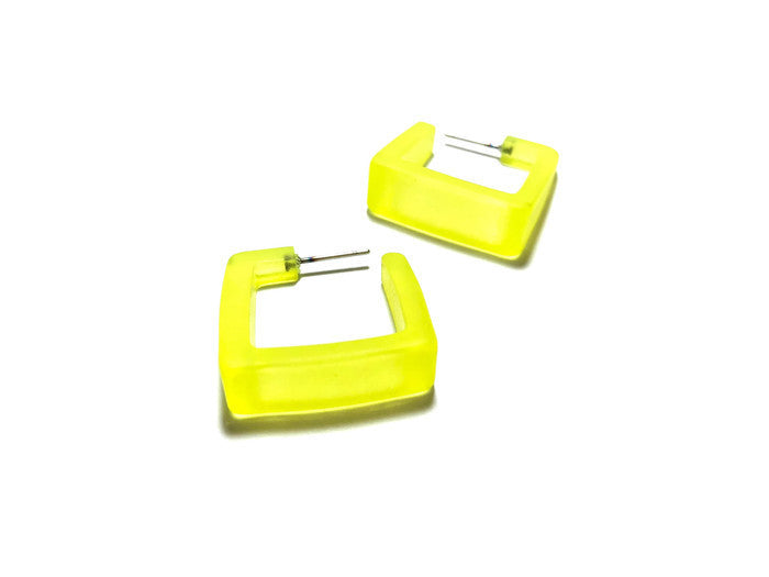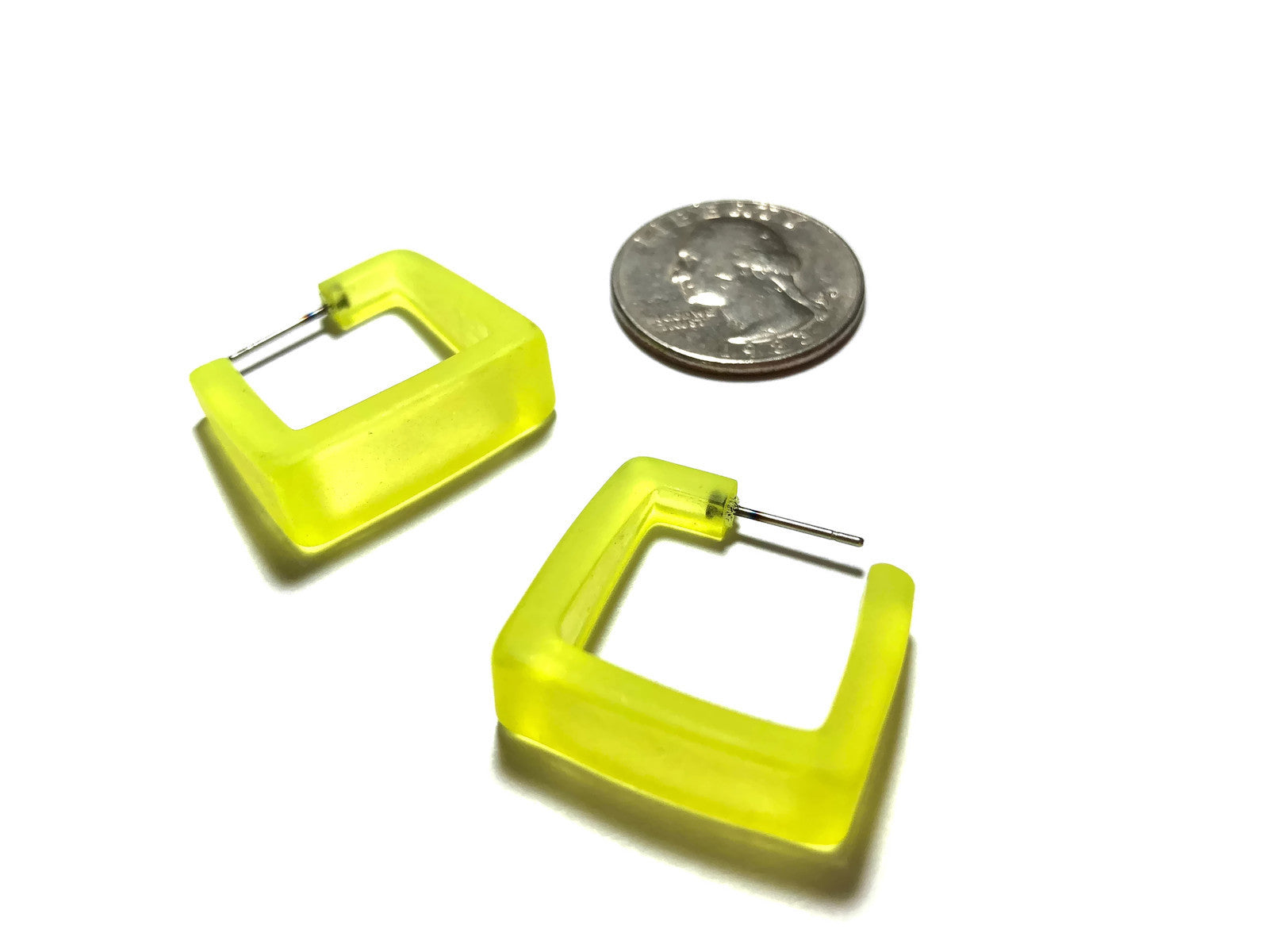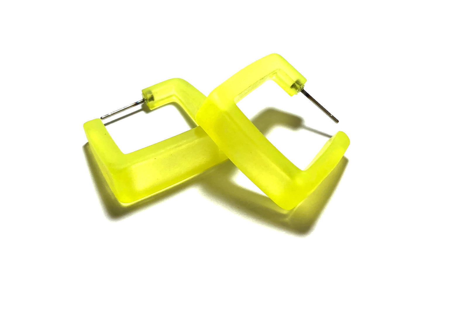 Get ready to jazz up your style with these Cubist Hoop Earrings! These vibrant geometric earrings feature a sleek, tapered design and a frosted finish. Each square hoop has a diameter of 1" or 25mm, adding a touch of minimalist cool to your look. Made with vintage lucite parts from the 1960's to early 80's, they're set with surgical steel earring posts and come with sturdy surgical steel/acrylic backings. Plus, they're lightweight and oh-so-fun to wear!