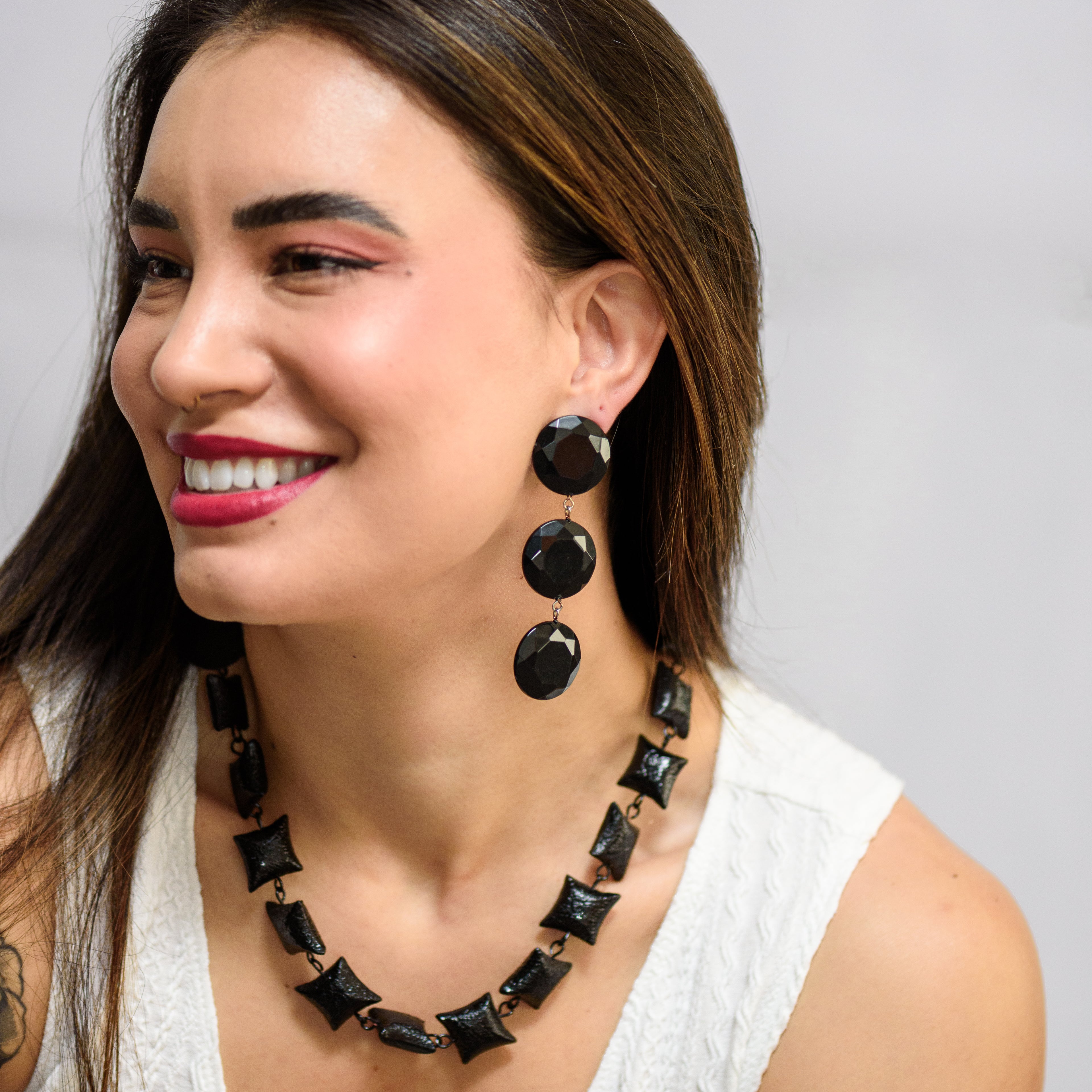 Have a blast with Obsidian Disco Night! This versatile piece features the same material in three ways - simple stud, tiny drop, and statement drop. Perfect for any occasion and all occasions!