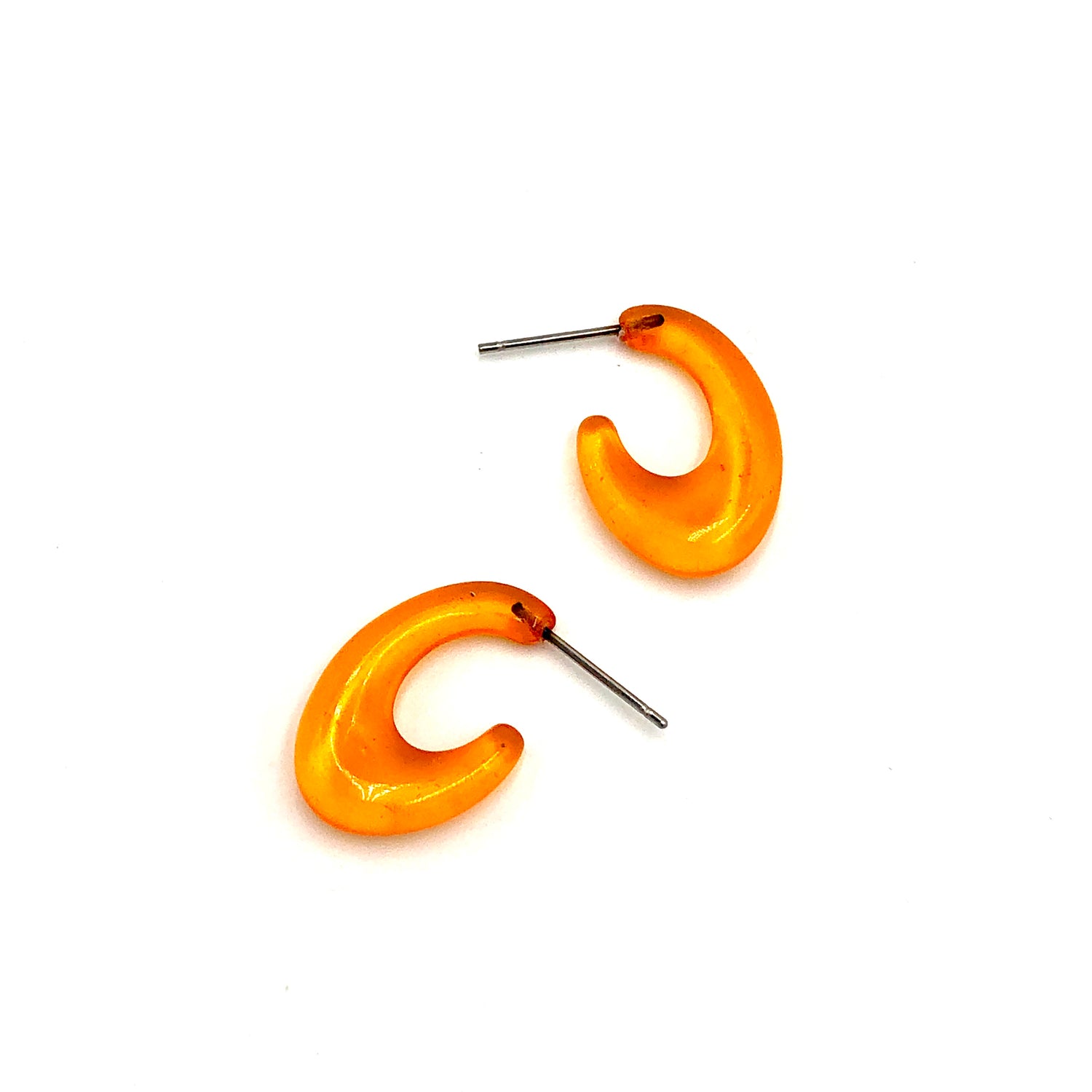 Frisco Hoop Earrings in a perfect narrow oval shape. Made with vintage lucite, each is just under 1" long or measures 23mm in length by 15mm in width. Super retro, organic shape, these are a light-weight earring set by hand with surgical steel. We unearthed these vintage plastics in Europe & finish them off in our AZ studio.