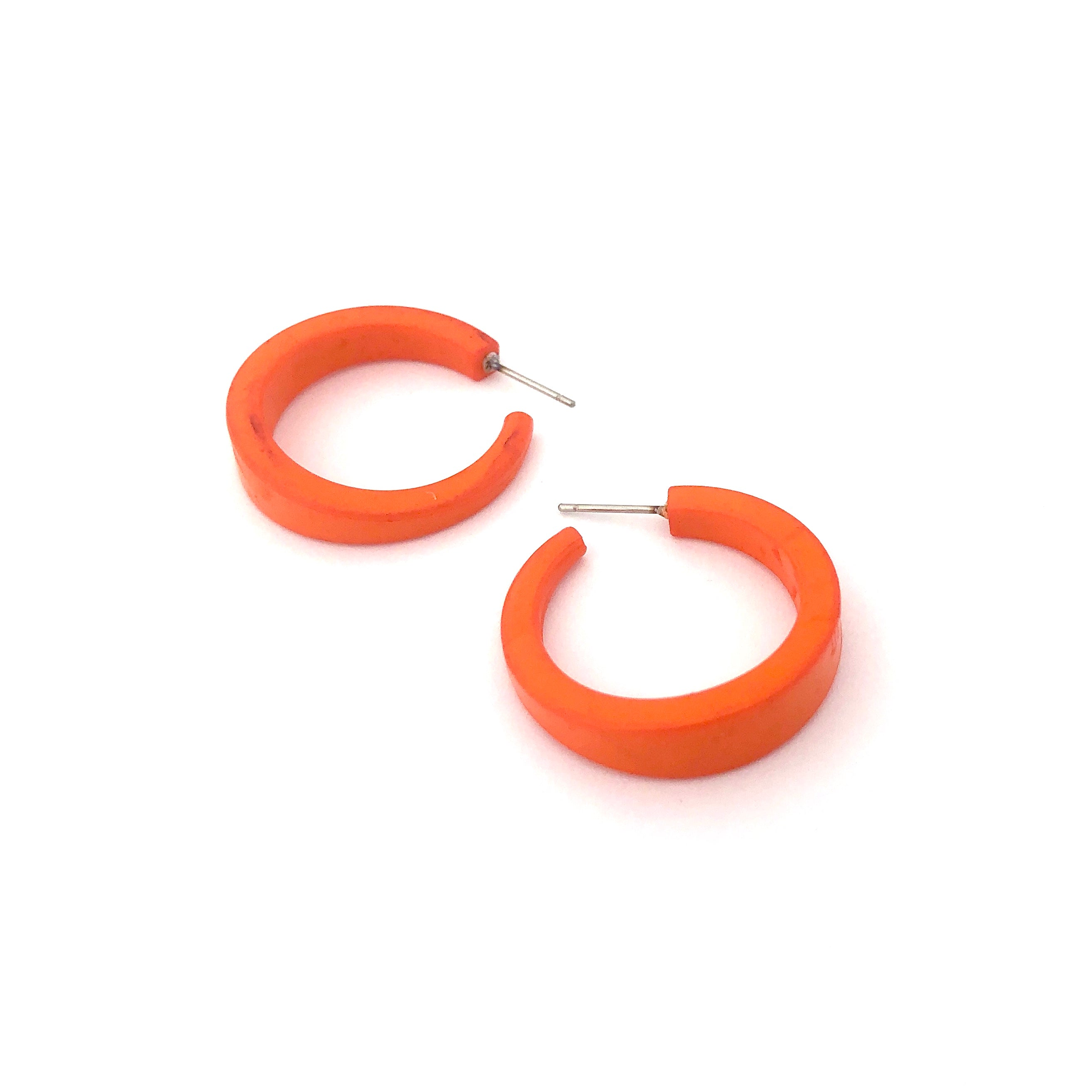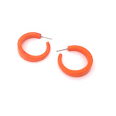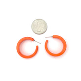 Lola Hoop Earring with a shiny opaque finish & some have a semi-matte wave textured pattern on the surface. A total pin-up girl's style. Hoops measure approximately 1.25" or 28mm in diameter and 7mm at the widest width, tapering down to about 3mm at the ends. See the model wearing a different color for size reference.