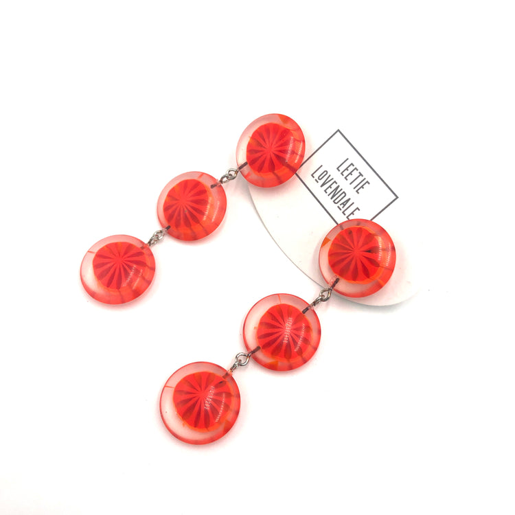 Incredibly rare orange & clear citrus sliced pieces make up these incredible and light weight statement earrings. Flat discs connected with steel wire creating retro fantastic statement earrings.