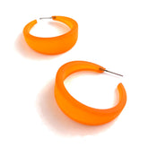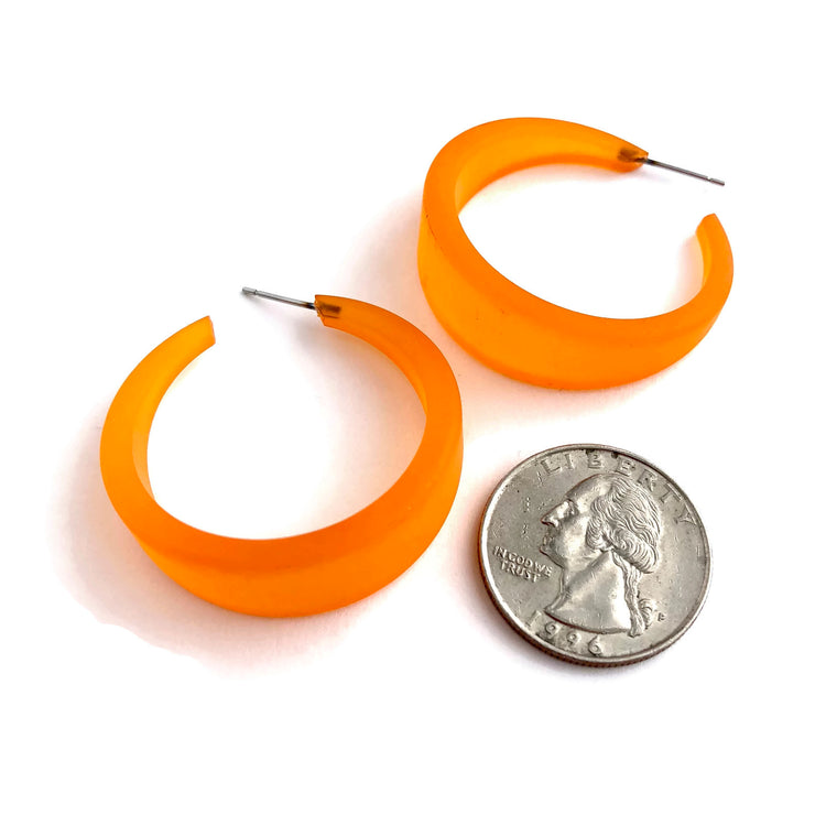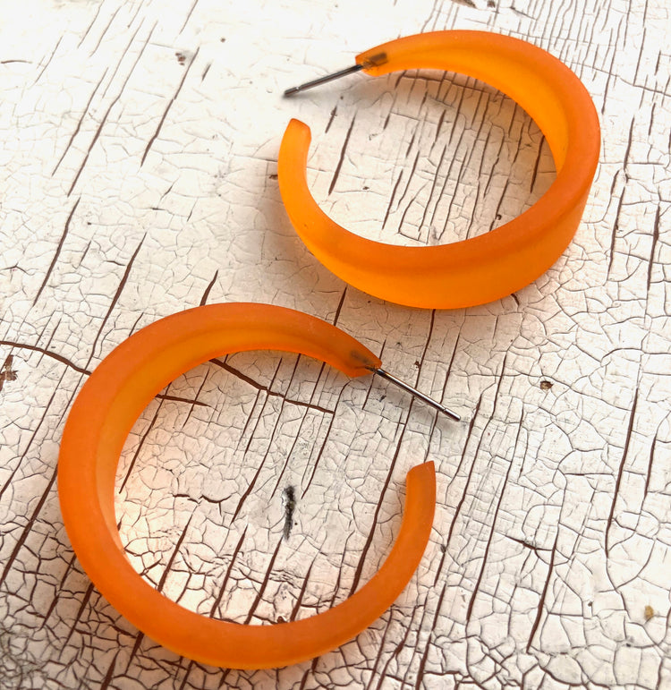 These hoop earrings made of vintage lucite in a frosted finish. The Emily Hoop is one of our most popular and largest styles. It's bold & lightweight, a great statement hoop earring. Each measures 1.5" in diameter and about 1/2" at the widest. This style comes in lots of other luscious colors. Be sure to check out the rest of the earrings in the shop for other color options in this same style.