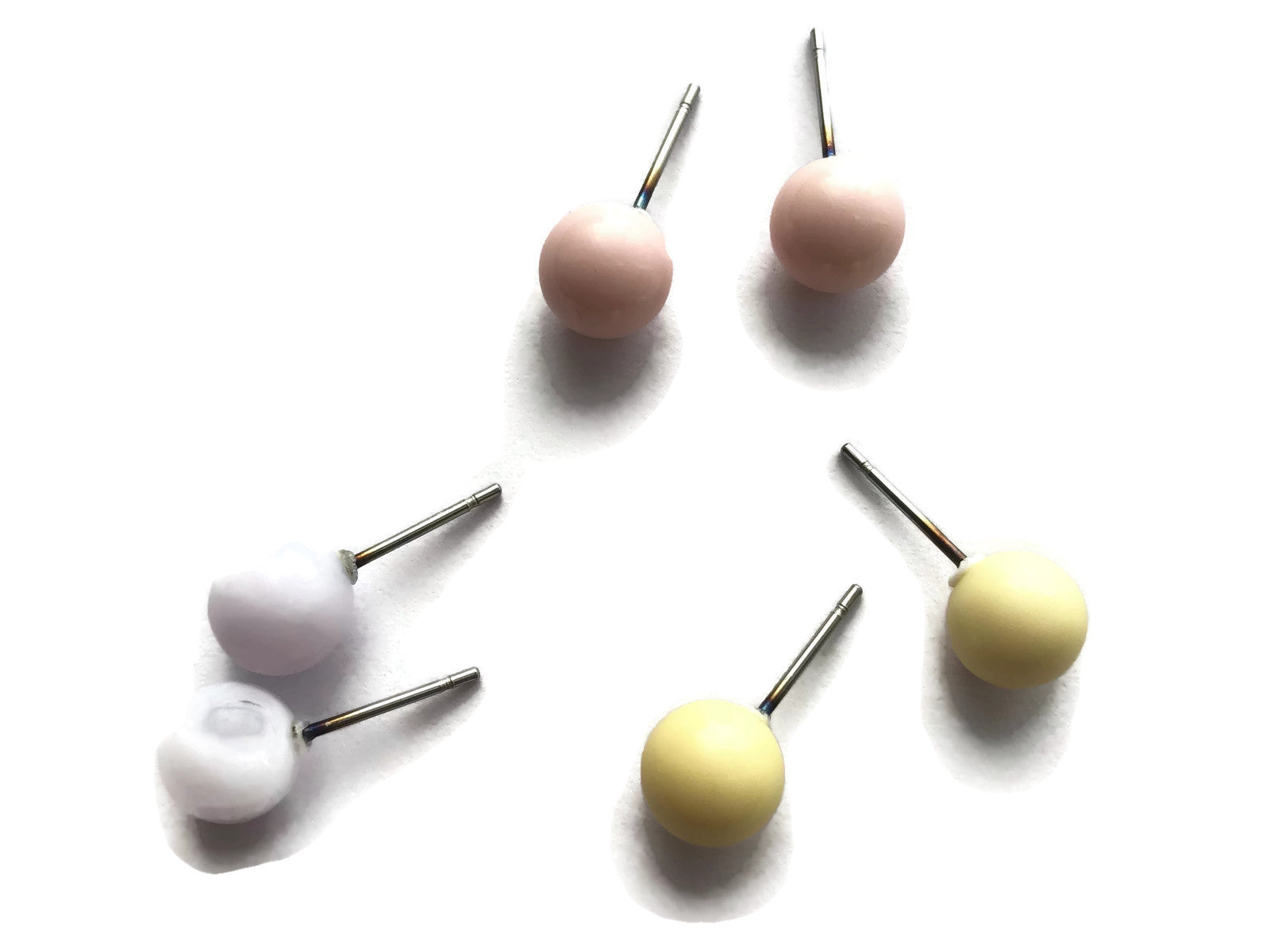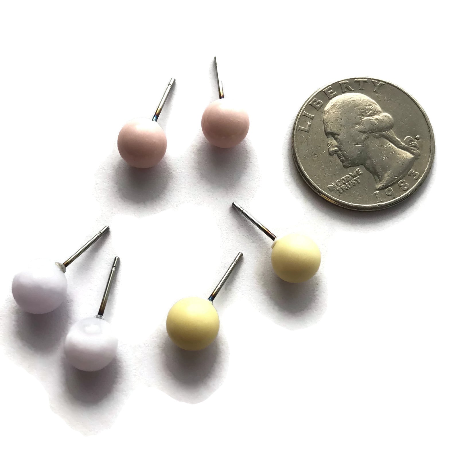 Stud earrings in the perfect size & round shape & in a pastel color mix. This set includes super light yellow, light pink & super light lilac purple stud earrings, measuring about 8mm in diameter. This set includes 3 pair of earrings in colors that you will love to rock.