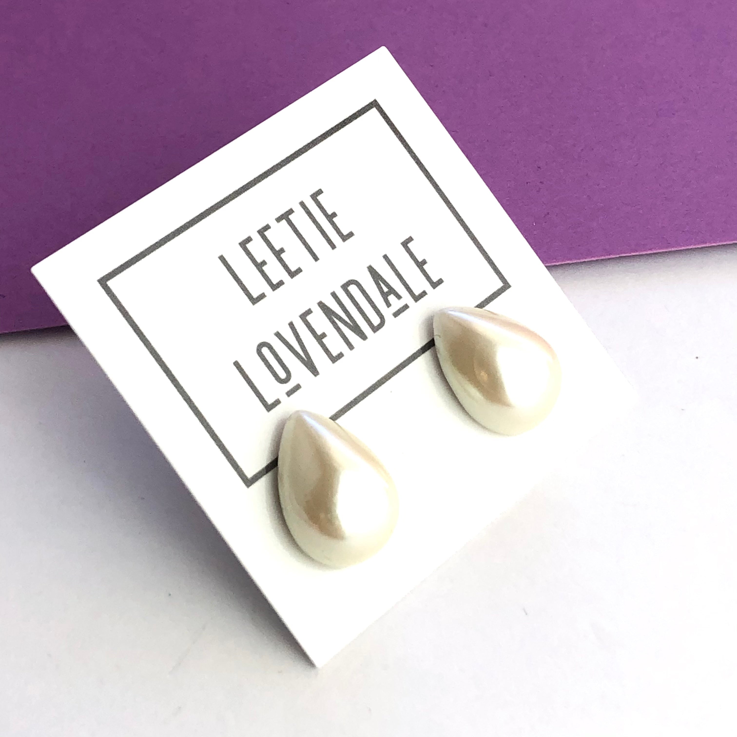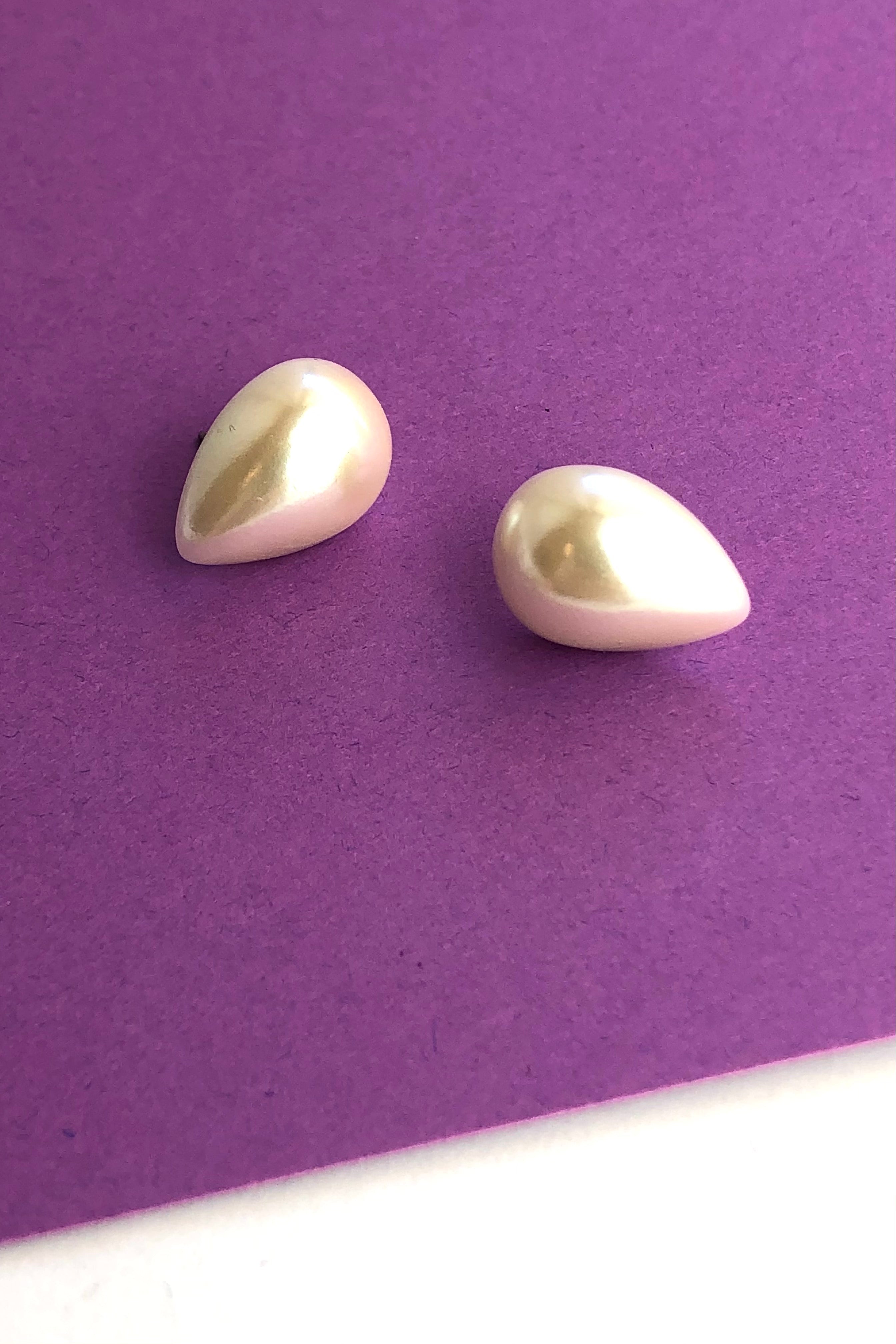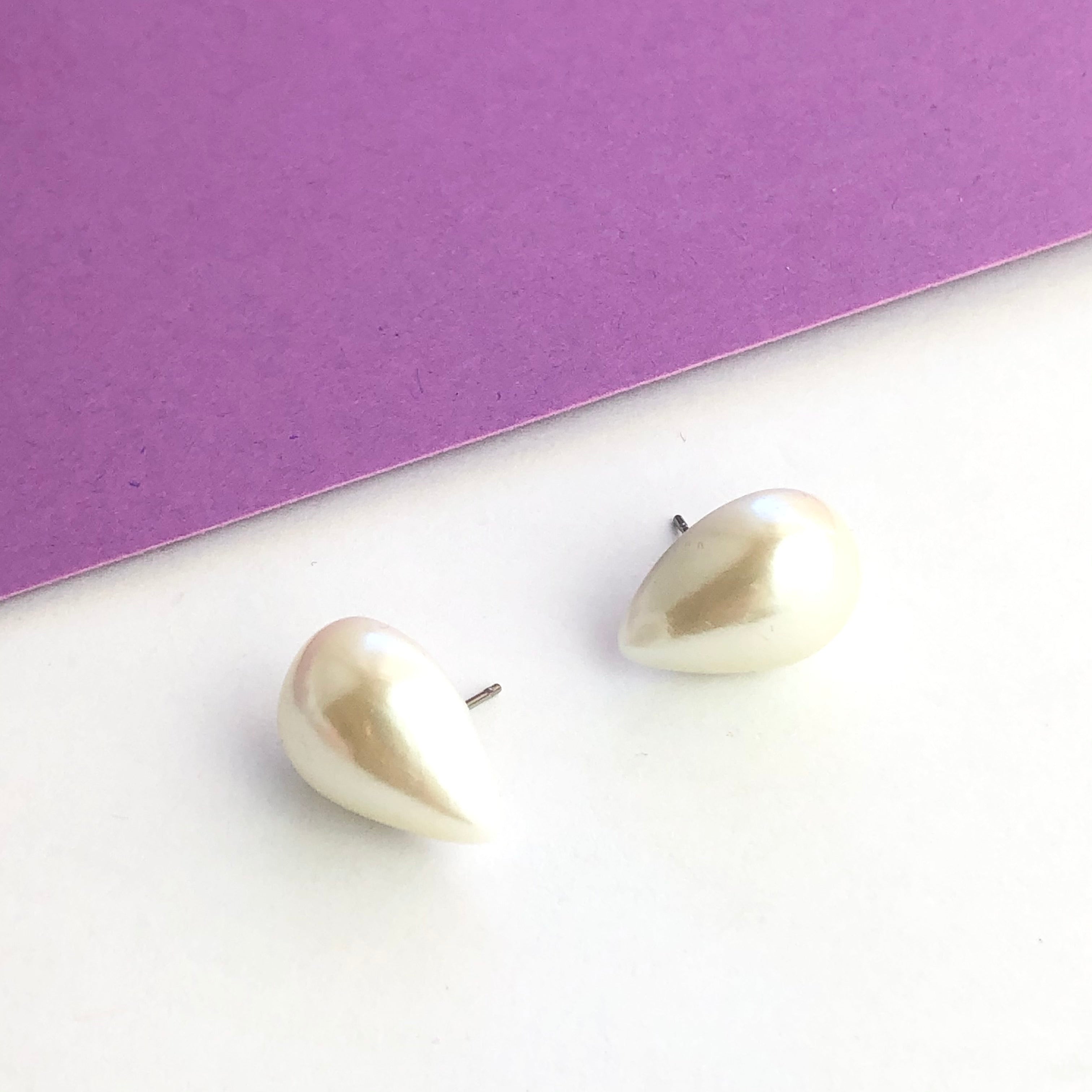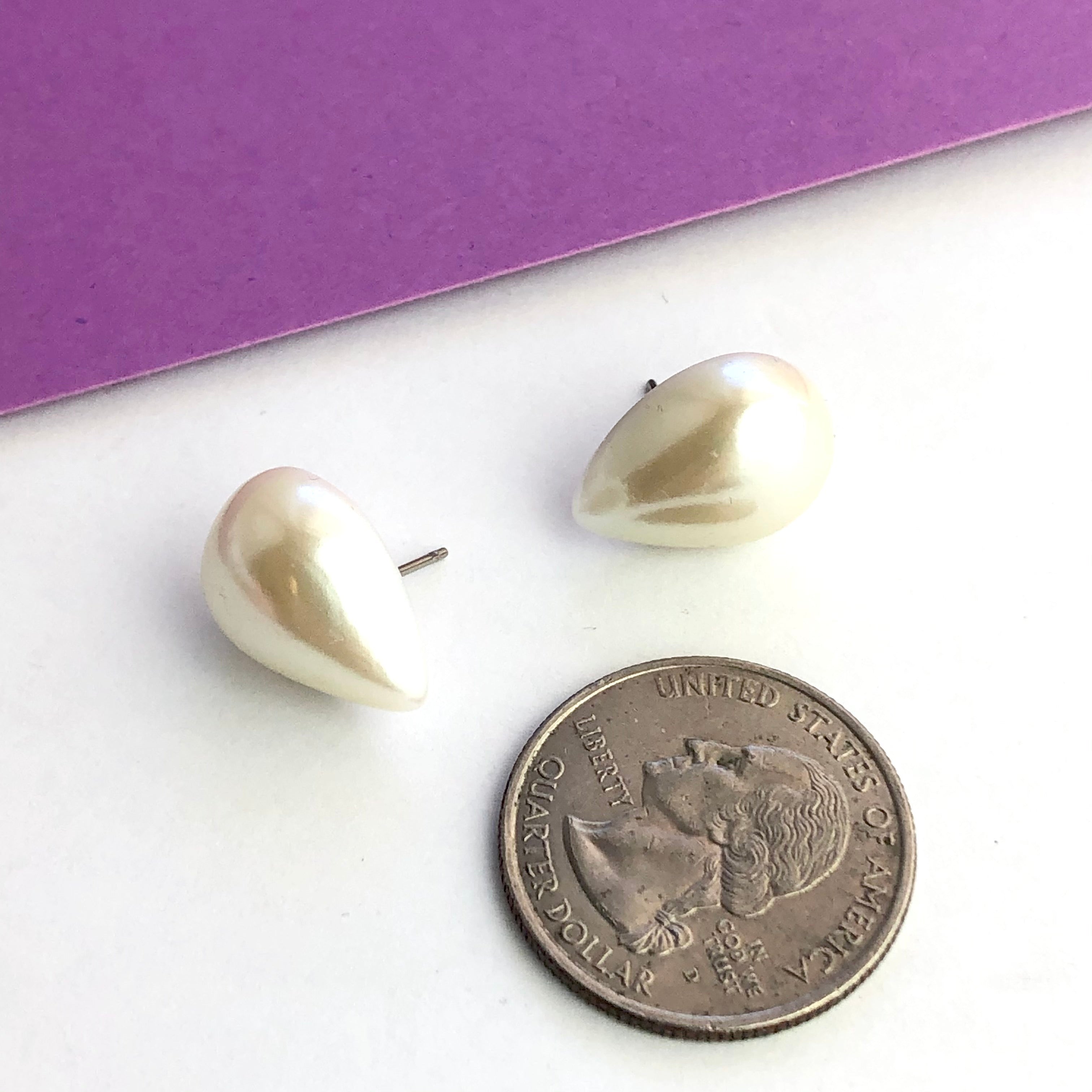 A pearlized antique white luster stud earring in a great teardrop shape. Each measures just about 13x18mm or about 3/4" in length top to bottom.