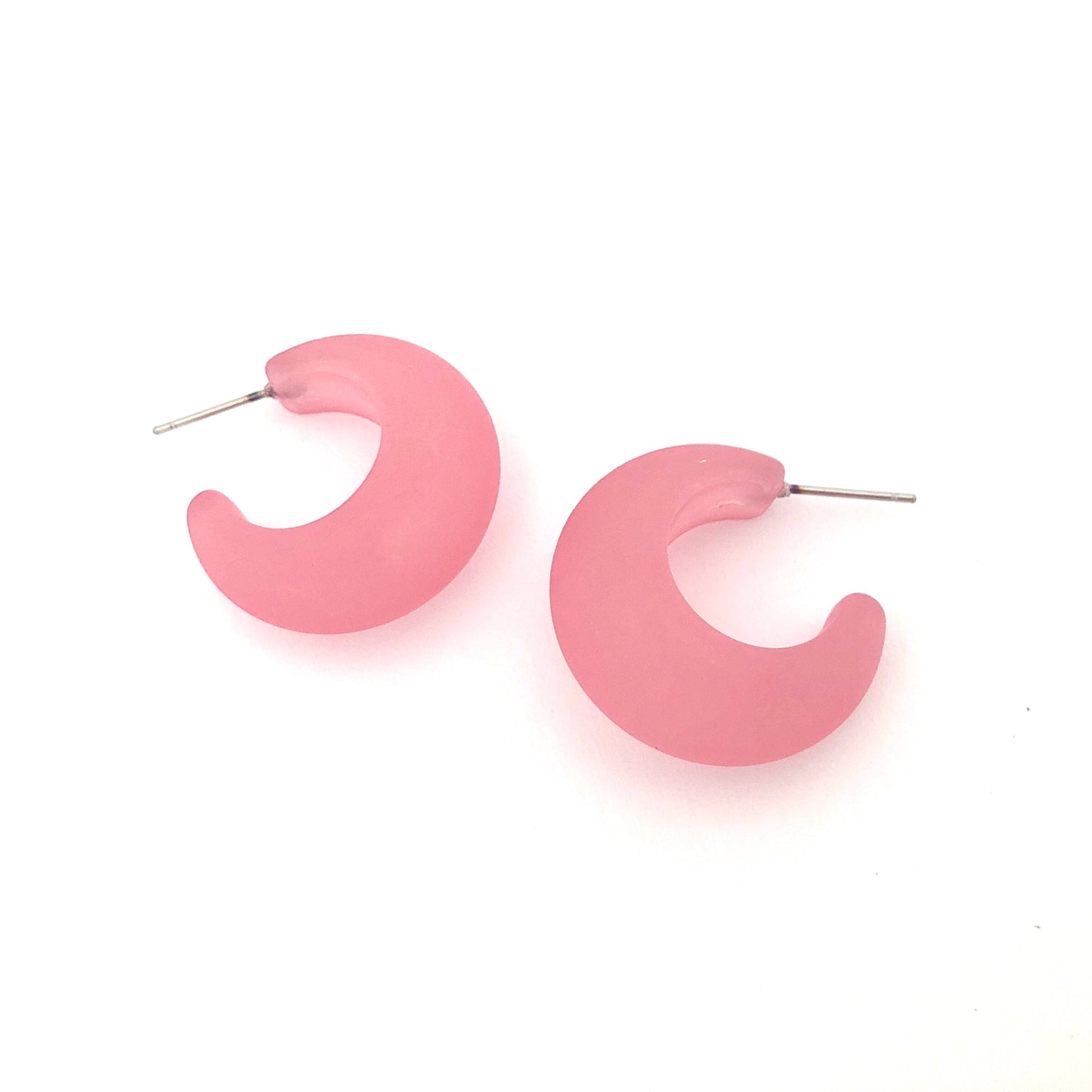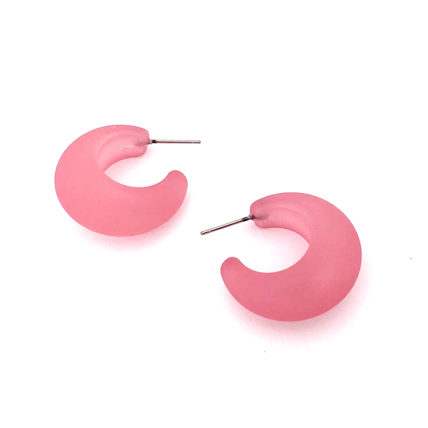 Hoop earrings with a frosted finish. This style hoop is called the Snail Shell Hoop & is  made of vintage matte lucite. Each measures just about 1 inch in diameter & 13mm in width at the widest point.