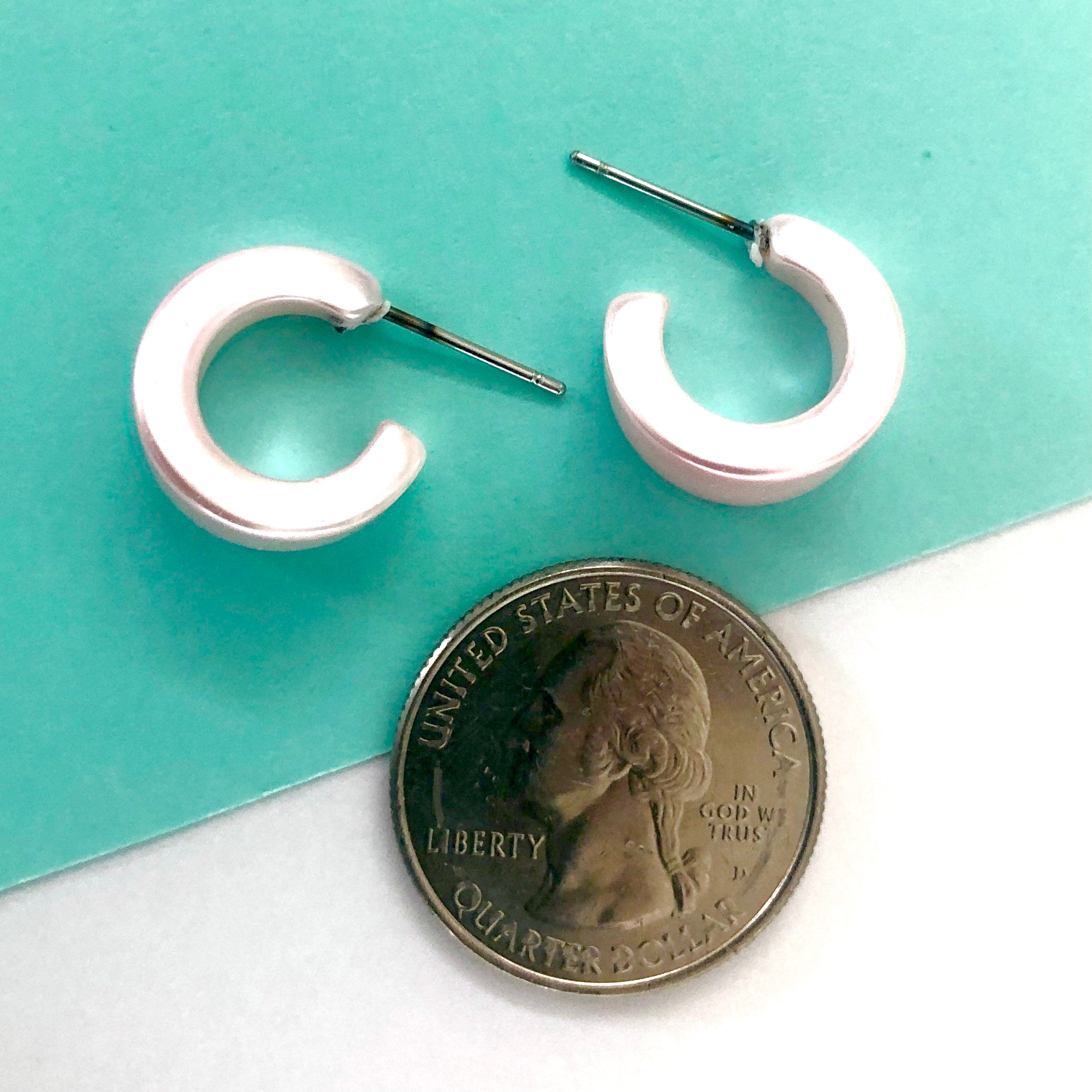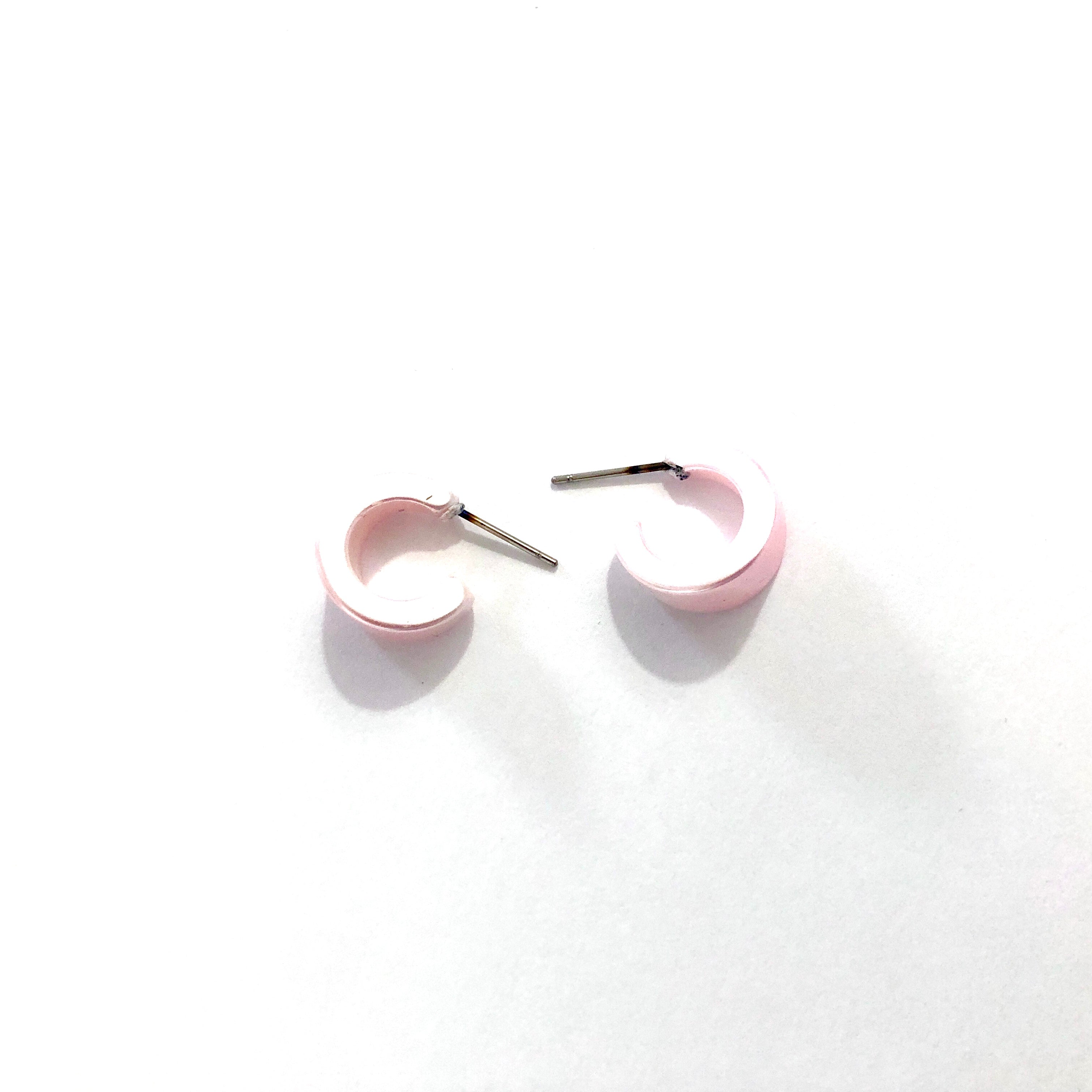 Lovely and small, lobe-hugging hoops in pale pink in a satin pearl finish. This is the Tiny Boom hoop style. Each measures approximately 16mm or 3/4" in diameter and 10mm in width slightly smaller than the Mini Boomer. The Tiny Boom Hoop is the smallest in the boom family (even smaller than the mini).
