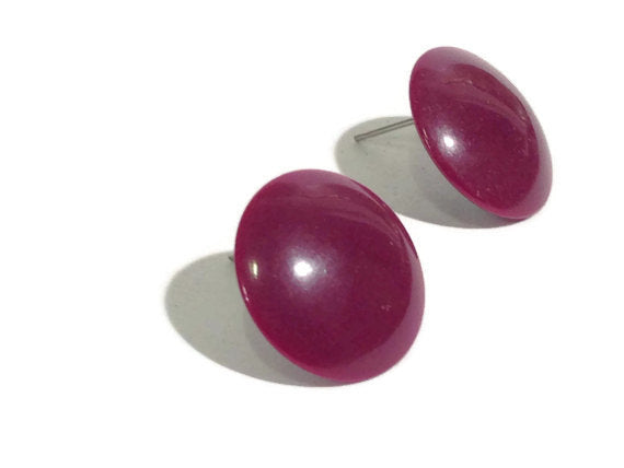 Deep plum purple disc earrings. Just under 3/4" or 18mm in diameter, these button earrings are the perfect mix of classic and mod retro.
