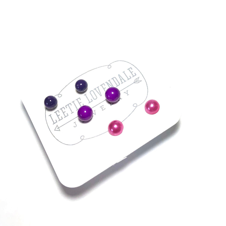 Purple tiny stud earrings in 3 varied tones from almost pink violet to dark purple. Tiny stud earring sizes, great for multi hole pierced ears or just lots of studs to choose from. Sizes range from 2-5mm. All arranged on one card - so these make a great gift!