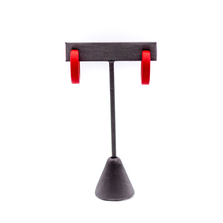 Cherry red hoop earrings with a matte finish. This is a fun style only available in this color. It measures 1" or 25mm in diameter. A great size that's not to big & not too small & the perfect pop of red!