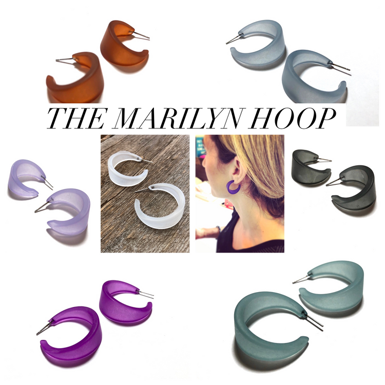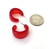 Hoop earrings in the small size of the Marilyn style hoop, a modern style hoop with a frosted finish. The Marilyn Hoop is a tapering or waning shape that starts & ends at a point and widens in the middle. The small version of the Marilyn Hoop measures 1" or 24mm in diameter and 14mm in width. Check out the last pic of the model wearing this size & style in the Clear and Red to get an idea of what they'll look like when you rock them!